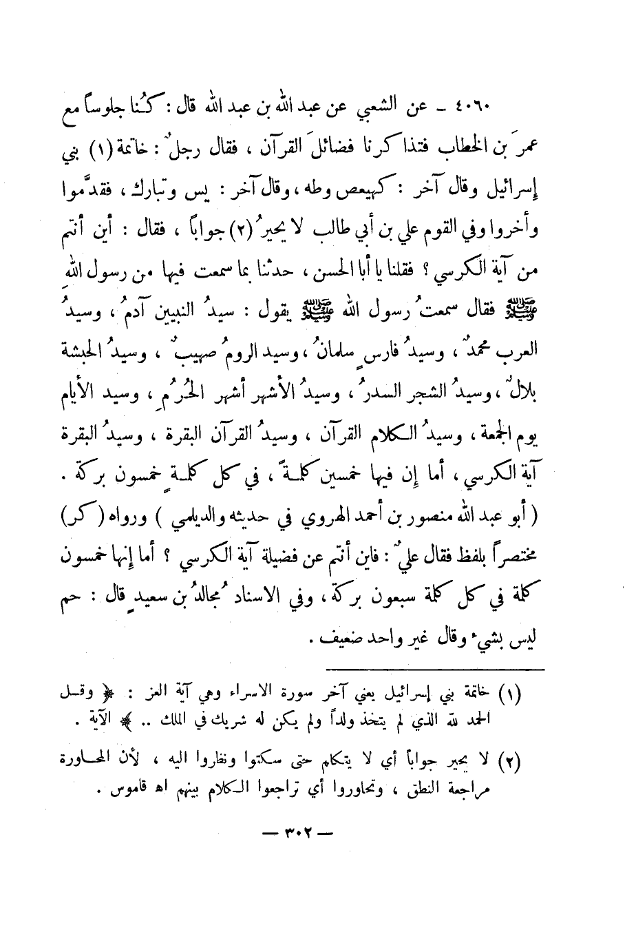 4060 - عن الشعبي عن عبد الله بن عبد الله قال: "كنا جلوسا مع عمر ابن الخطاب فتذاكرنا فضائل القرآن، فقال رجل: خاتمة1 بني إسرائيل وقال آخر: كهيعص وطه، وقال آخر: يس وتبارك، فقدموا وأخروا وفي القوم علي بن أبي طالب لا يحير2 جوابا، فقال: أين أنتم من آية الكرسي؟ فقلنا يا أبا الحسن، حدثنا بما سمعت فيها من رسول الله صلى الله عليه وسلم فقال سمعت رسول الله صلى الله عليه وسلم يقول: " سيد النبيين آدم، وسيد العرب محمد، وسيد فارس سلمان، وسيد الروم صهيب، وسيد الحبشة بلال، وسيد الشجر السدر، وسيد الأشهر أشهر الحرم، وسيد الأيام يوم الجمعة، وسيد الكلام القرآن، وسيد القرآن البقرة، وسيد البقرة آية الكرسي، أما إن فيها خمسين كلمة، في كل كلمة خمسون بركة". "أبو عبد الله منصور بن أحمد الهروي في حديثه والديلمي" ورواه "كر" مختصرا بلفظ فقال علي: فأين أنتم عن فضيلة آية الكرسي؟ أما إنها خمسون كلمة في كل كلمة سبعون بركة، وفي الإسناد مجالد بن سعيد قال: حم ليس بشيء وقال غير واحد ضعيف.