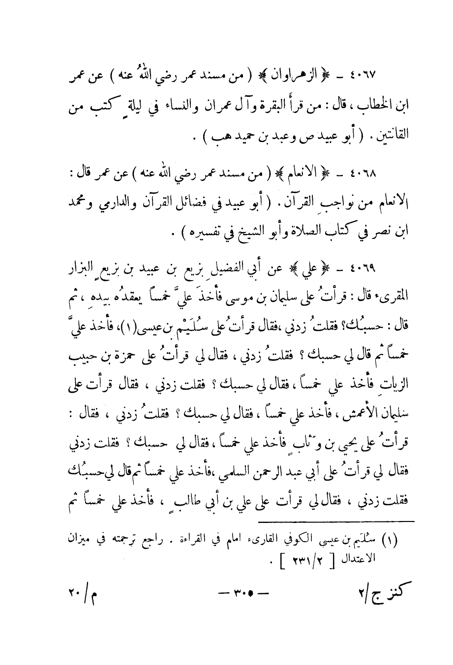 4069 – "علي" عن أبي الفضيل بزيع بن عبيد بن بزيع البزار المقرئ قال: "قرأت على سليمان بن موسى فأخذ علي خمسا يعقده بيده، ثم قال: حسبك؟ فقلت زدني، فقال قرأت على سليم بن عيسى1 فأخذ علي خمسا ثم قال لي حسبك؟ فقلت زدني، فقال لي قرأت على حمزة بن حبيب الزيات فأخذ علي خمسا، فقال لي حسبك؟ فقلت زدني، فقال قرأت على سليمان الأعمش، فأخذ علي خمسا، فقال لي حسبك؟ فقلت زدني، فقال: قرأت على يحيى بن وثاب فأخذ علي خمسا، فقال لي حسبك؟ فقلت زدني فقال لي قرأت على أبي عبد الرحمن السلمي، فأخذ علي خمسا ثم قال لي حسبك فقلت زدني، فقال لي قرأت على علي بن أبي طالب، فأخذ علي خمسا ثم