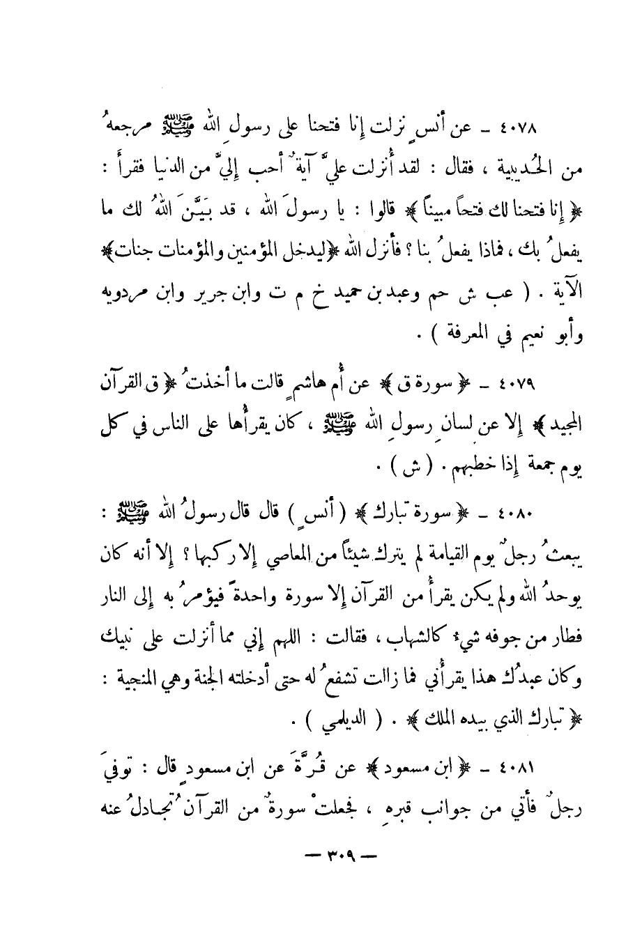 4079 – "سورة ق" عن أم هاشم قالت "ما أخذت {ق وَالْقُرْآنِ الْمَجِيدِ} إلا عن لسان رسول الله صلى الله عليه وسلم، كان يقرأها على الناس في كل يوم جمعة إذا خطبهم". "ش".