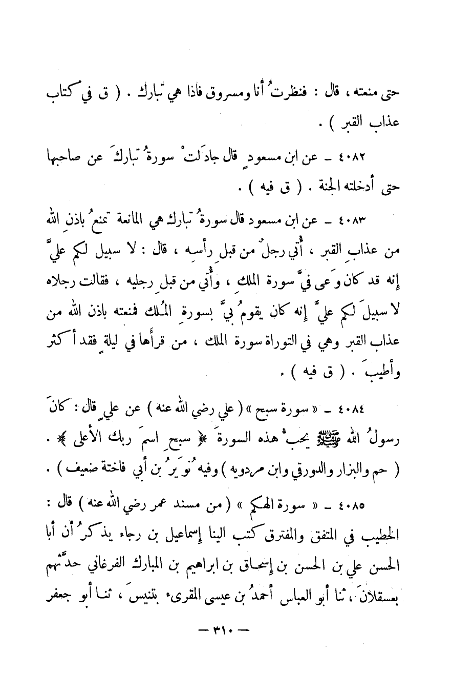 4085 – "سورة ألهكم" "من مسند عمر رضي الله عنه" قال: "الخطيب في المتفق والمفترق كتب إلينا إسماعيل بن رجاء يذكر أن أبا الحسن علي بن الحسن بن إسحاق بن إبراهيم بن المبارك الفرغاني حدثهم بعسقلان، ثنا أبو العباس أحمد بن عيسى المقرئ بتنيس، ثنا أبو جعفر