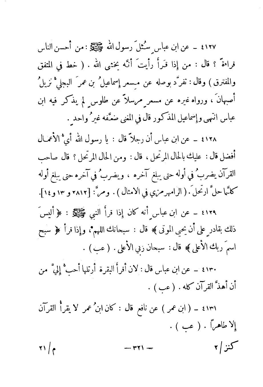 4131 - "ابن عمر" عن نافع قال: "كان ابن عمر لا يقرأ القرآن إلا طاهرا". "عب".