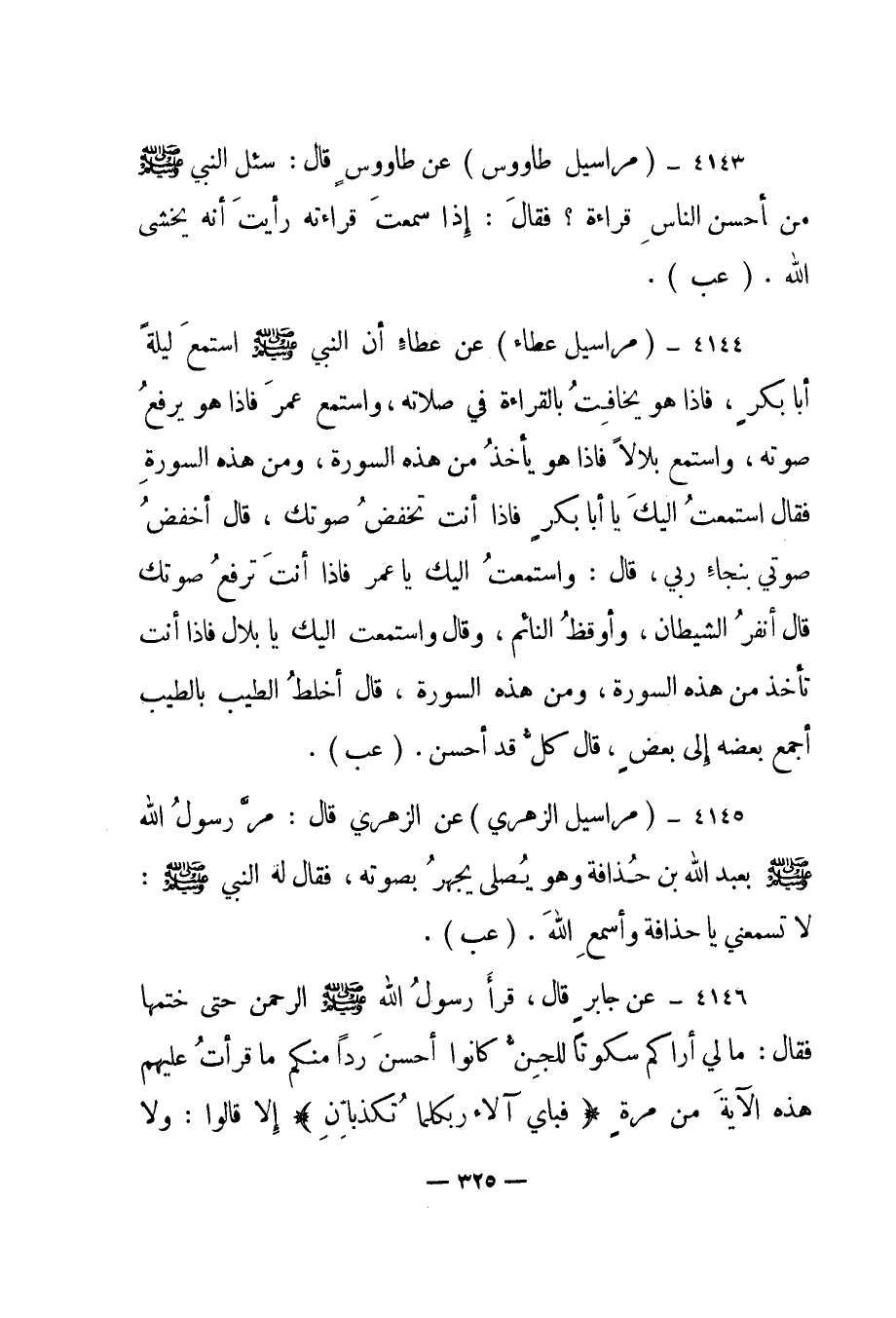 4143 - "مراسيل طاووس" عن طاووس قال: "سئل النبي صلى الله عليه وسلم من أحسن الناس قراءة؟ فقال: إذا سمعت قراءته رأيت أنه يخشى الله". "عب".
