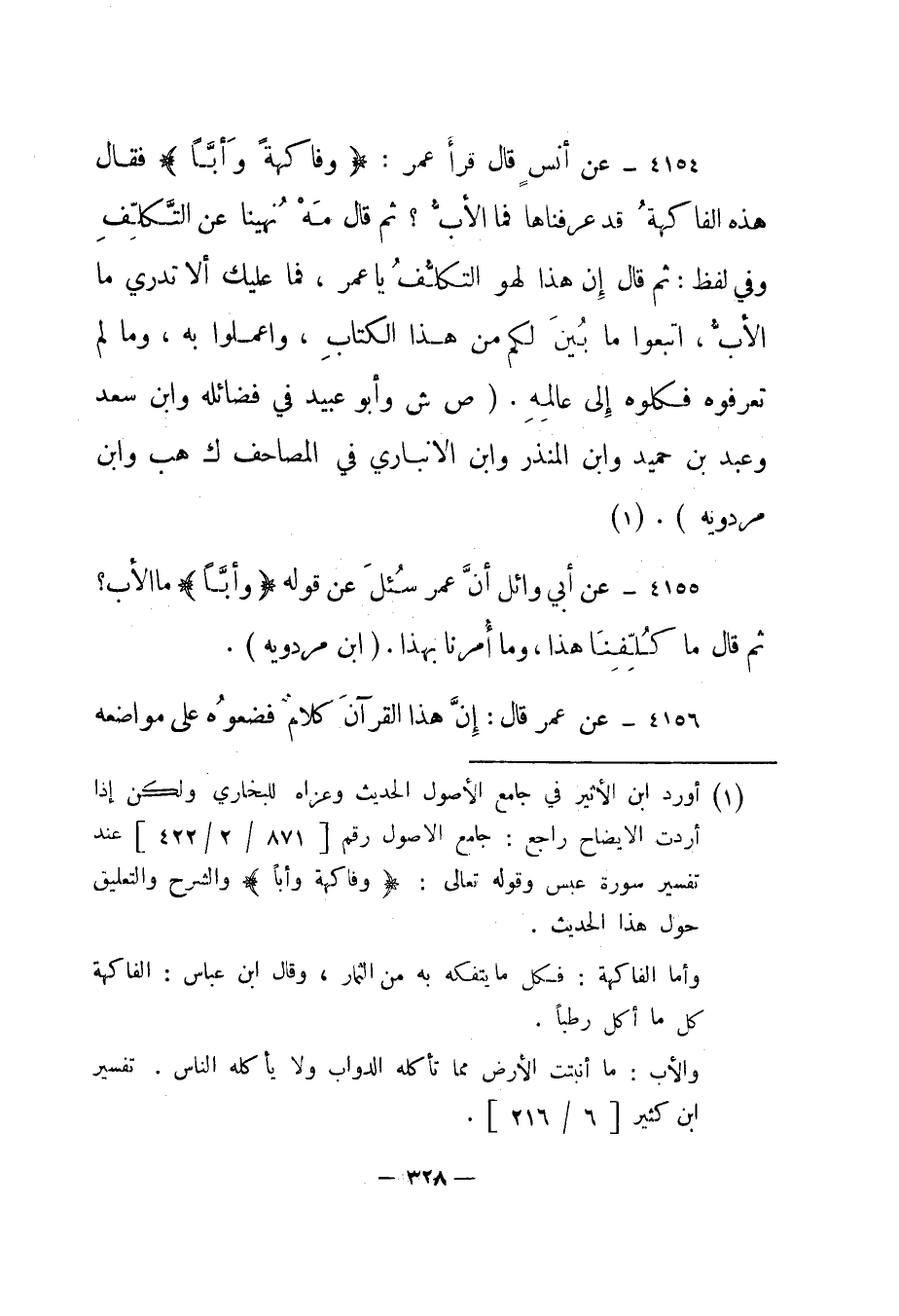 4154 - عن أنس قال قرأ عمر: " {وَفَاكِهَةً وَأَبّاً} فقال هذه الفاكهة قد عرفناها فما الأب؟ ثم قال مه نهينا عن التكلف وفي لفظ: ثم قال إن هذا لهو التكلف يا عمر، فما عليك ألا تدري ما الأب، اتبعوا ما بين لكم من هذا الكتاب، واعملوا به، وما لم تعرفوه فكلوه إلى عالمه". "ص ش وأبو عبيد في فضائله وابن سعد وعبد بن حميد وابن المنذر وابن الأنباري في المصاحف ك هب وابن مردويه". 1