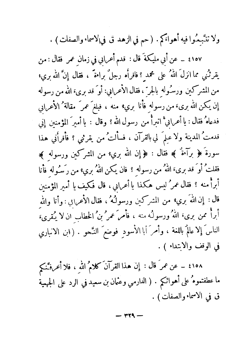4158 - عن عمر قال:"إن هذا القرآن كلام الله، فلا أعرفنكم ما عطفتموه على أهوائكم". "الدارمي وعثمان بن سعيد في الرد على الجهمية ق في الأسماء والصفات".