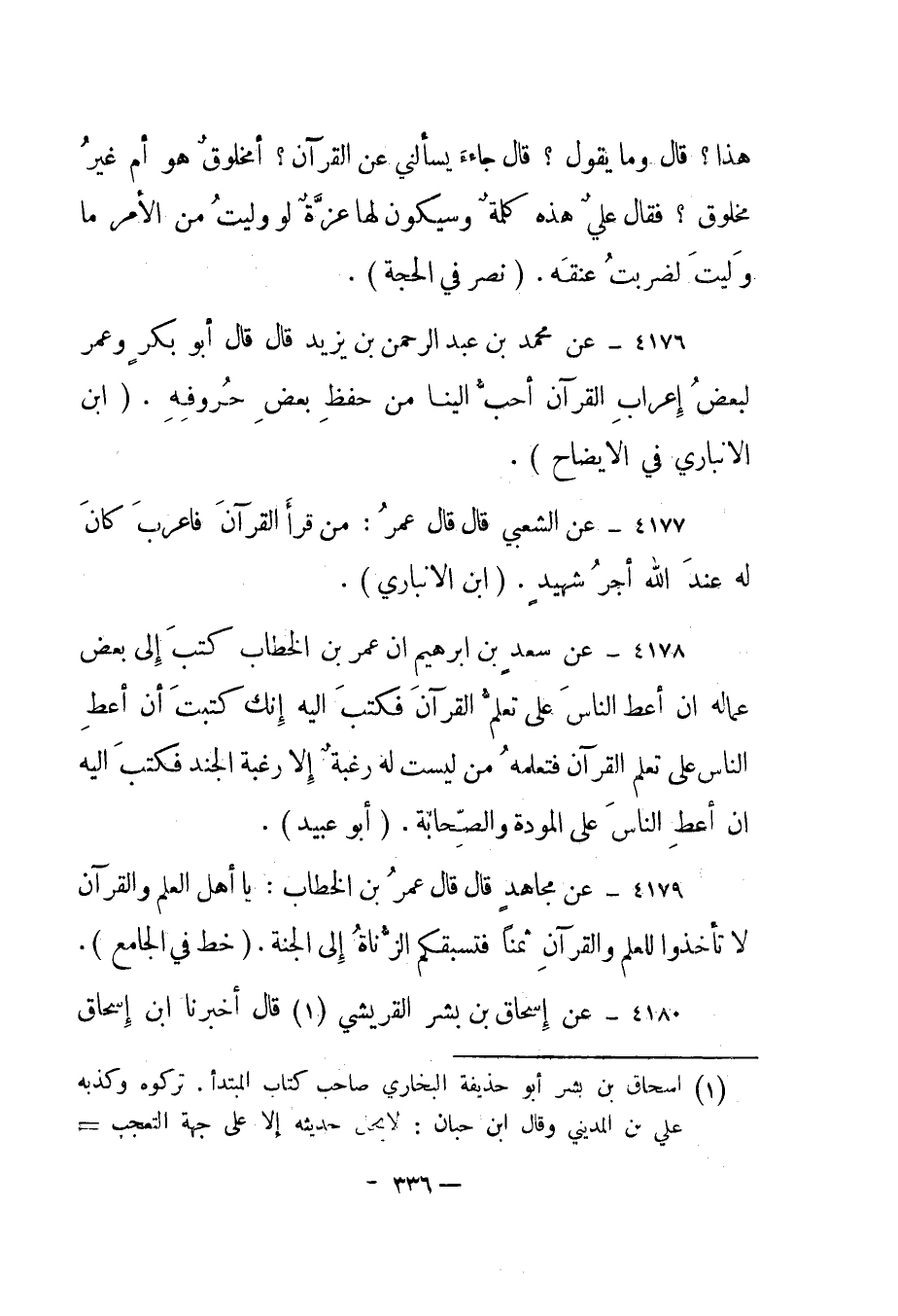 4176 - عن محمد بن عبد الرحمن بن يزيد قال "قال أبو بكر وعمر لبعض إعراب القرآن أحب إلينا من حفظ بعض حروفه". "ابن الأنباري في الإيضاح".