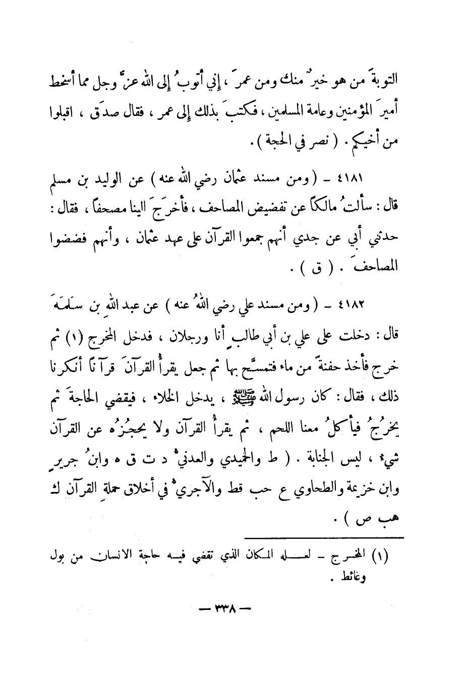 4182 - "ومن مسند علي رضي الله عنه" عن عبد الله بن سلمة قال: "دخلت على علي بن أبي طالب أنا ورجلان، فدخل المخرج1 ثم خرج فأخذ حفنة من ماء فتمسح بها ثم جعل يقرأ القرآن فرآنا أنكرنا ذلك، فقال: كان رسول الله صلى الله عليه وسلم، يدخل الخلاء، فيقضي الحاجة ثم يخرج فيأكل معنا اللحم، ثم يقرأ القرآن ولا يحجزه عن القرآن شيء، ليس الجنابة". "ط والحميدي والعدني د ت ق هـ وابن جرير وابن خزيمة والطحاوي ع حب قط والآجري في أخلاق حملة القرآن ك هب ص".