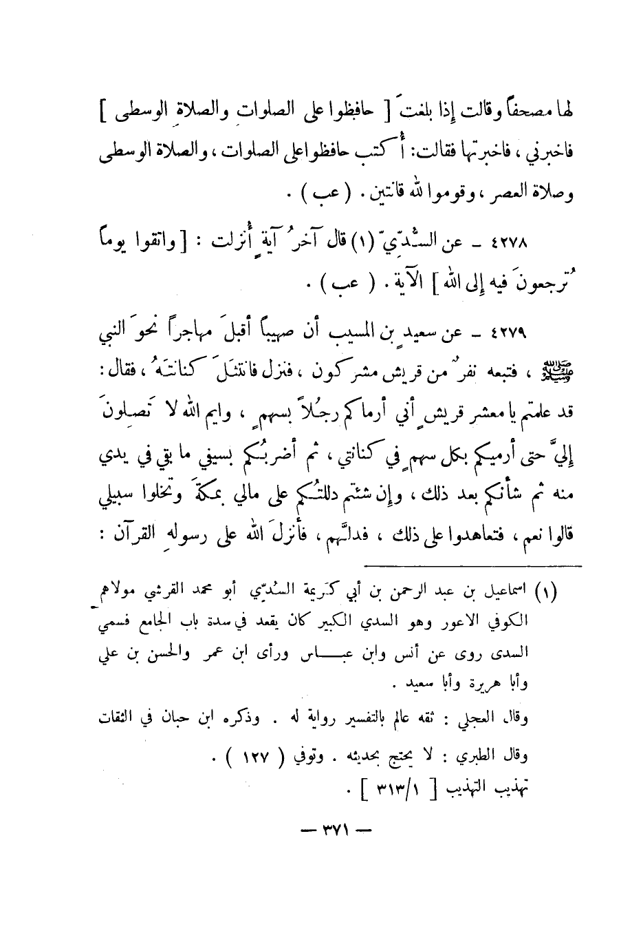 1 إسماعيل بن عبد الرحمن بن أبي كريمة السدي أبو محمد القرشي مولاهم الكوفي الأعور وهو السدي الكبير كان يقعد في سدة باب الجامع فسمي السدى روى عن أنس وابن عباس ورأى ابن عمر والحسن بن علي وأبا هريرة وأبا سعيد.