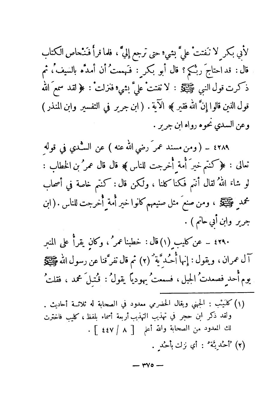 4289 - "ومن مسند عمر رضي الله عنه" عن السدي في قوله تعالى: {كُنْتُمْ خَيْرَ أُمَّةٍ أُخْرِجَتْ لِلنَّاسِ} قال قال عمر بن الخطاب: "لو شاء الله لقال أنتم فكنا كلنا، ولكن قال: كنتم خاصة في أصحاب محمد صلى الله عليه وسلم، ومن صنع مثل صنيعهم كانوا خير أمة أخرجت للناس". "ابن جرير وابن أبي حاتم".