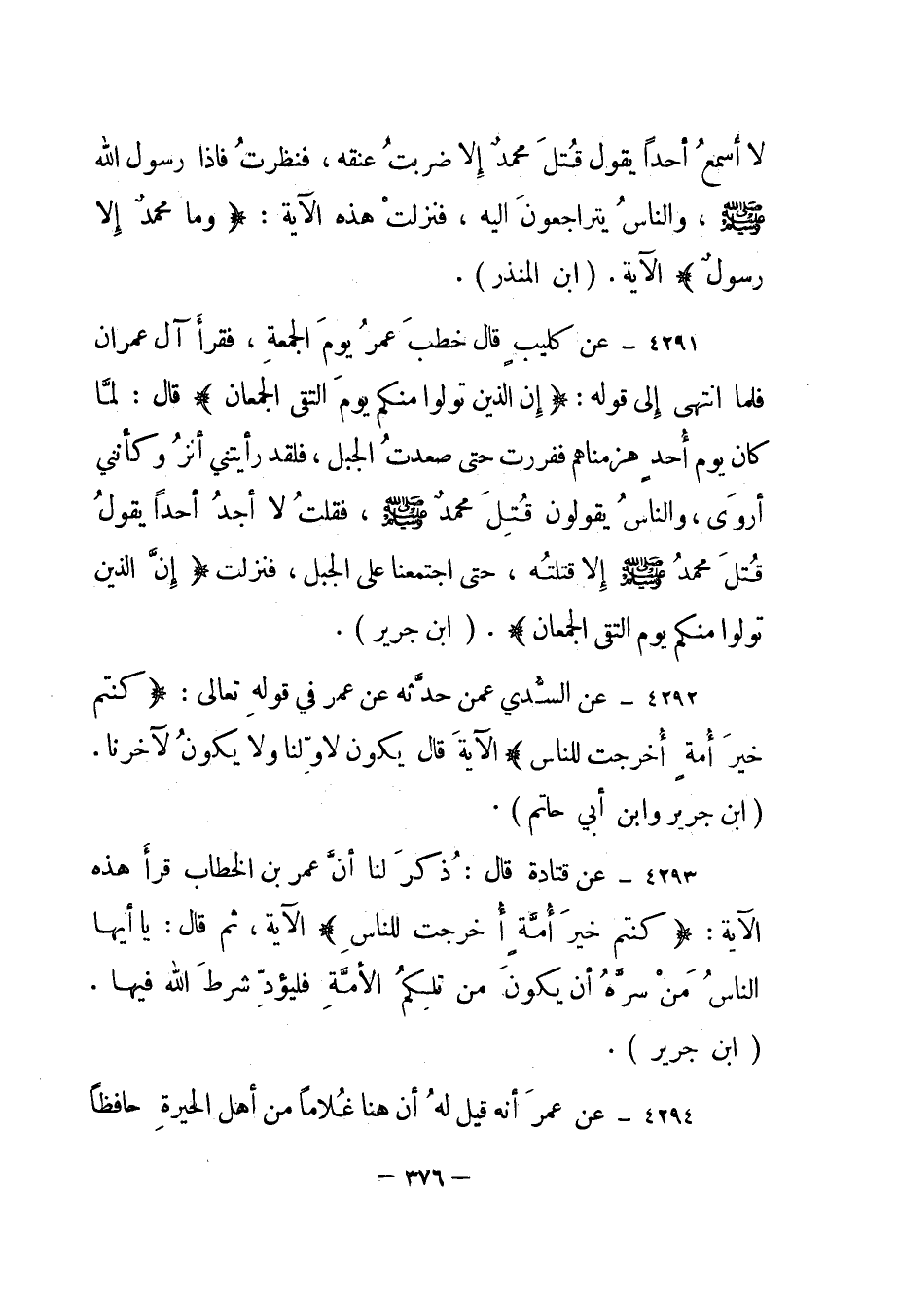 4293 - عن قتادة قال: "ذكر لنا أن عمر بن الخطاب قرأ هذه الاية: {كُنْتُمْ خَيْرَ أُمَّةٍ أُخْرِجَتْ لِلنَّاسِ} الآية، ثم قال: يا أيها الناس من سره أن يكون من تلكم الأمة فليؤد شرط الله فيها". "ابن جرير".