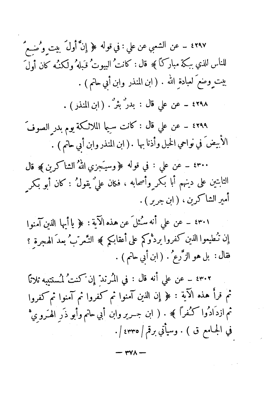 4300 - عن علي: في قوله {وَسَيَجْزِي اللَّهُ الشَّاكِرِينَ} قال الثابتين على دينهم أبا بكر وأصحابه، فكان علي يقول: "كان أبو بكر أمير الشاكرين". "ابن جرير".