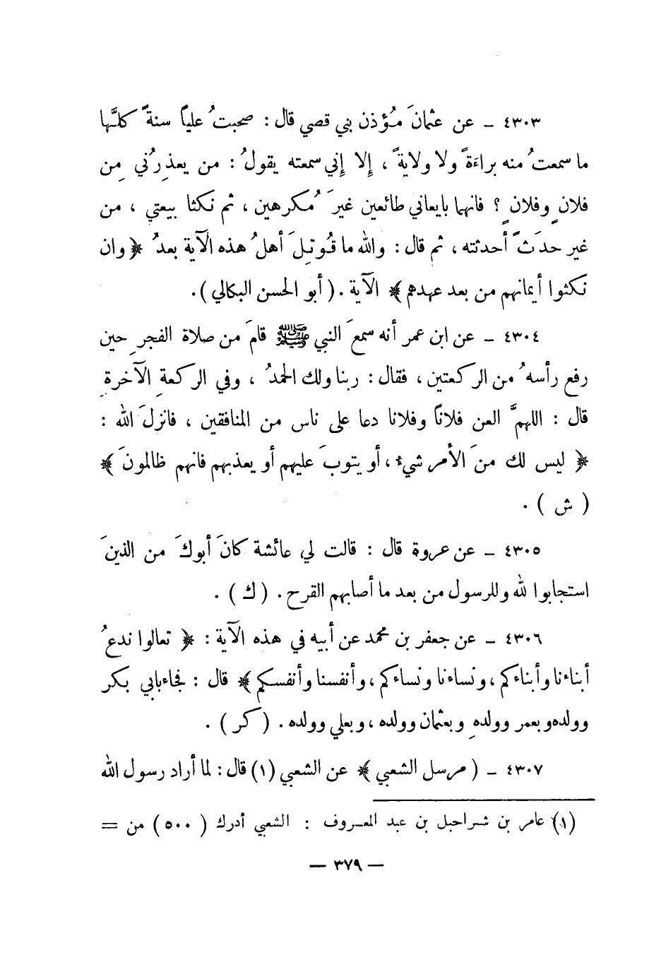 4306 - عن جعفر بن محمد عن أبيه في هذه الآية: {تَعَالَوْا نَدْعُ أَبْنَاءَنَا وَأَبْنَاءَكُمْ وَنِسَاءَنَا وَنِسَاءَكُمْ وَأَنْفُسَنَا وَأَنْفُسَكُمْ} قال: "فجاء بأبي بكر وولده وبعمر وولده وبعثمان وولده، وبعلي وولده". "كر".