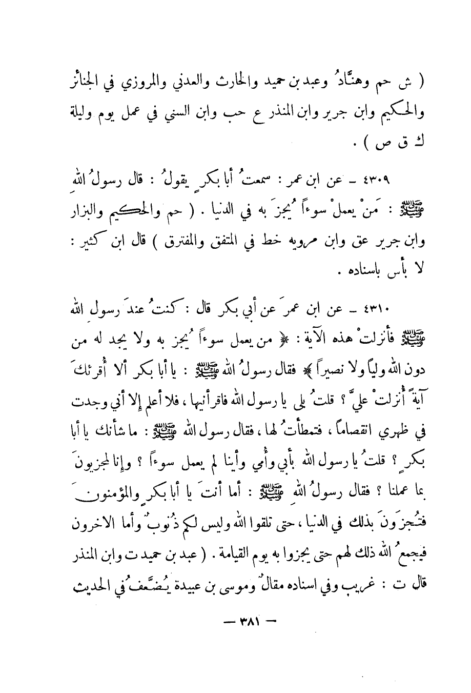 4310 - عن ابن عمر عن أبي بكر قال: كنت عند رسول الله صلى الله عليه وسلم فأنزلت هذه الآية: {مَنْ يَعْمَلْ سُوءاً يُجْزَ بِهِ وَلا يَجِدْ لَهُ مِنْ دُونِ اللَّهِ وَلِيّاً وَلا نَصِيراً} فقال رسول الله صلى الله عليه وسلم: "يا أبا بكر ألا أقرئك آية أنزلت علي؟ قلت بلى يا رسول الله فأقرأنيها، فلا أعلم إلا أني وجدت في ظهري انقصاما، فتمطأت لها، فقال رسول الله صلى الله عليه وسلم: ما شأنك يا أبا بكر؟ قلت يا رسول الله بأبي وأمي وأينا لم يعمل سوءا؟ وإنا لمجزيون بما عملنا؟ فقال رسول الله صلى الله عليه وسلم: أما أنت يا أبا بكر والمؤمنون فتجزون بذلك في الدنيا، حتى تلقوا الله وليس لكم ذنوب وأما الآخرون فيجمع الله ذلك لهم حتى يجزوا به يوم القيامة". "عبد بن حميد ت وابن المنذر قال ت: غريب وفي إسناده مقال وموسى بن عبيدة يضعف في الحديث