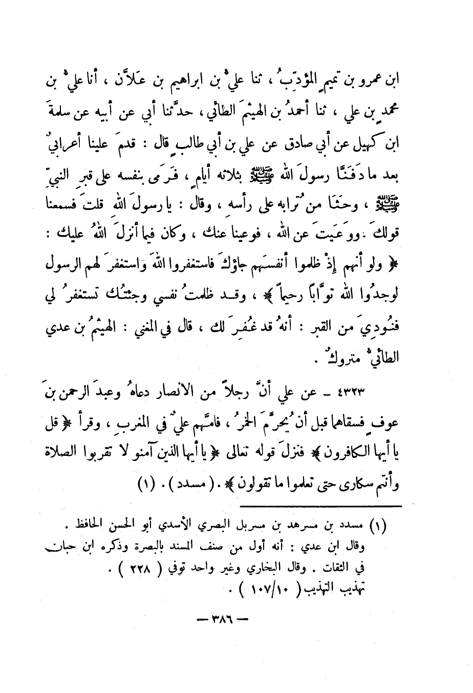 ابن عمرو بن تميم المؤدب، ثنا علي بن إبراهيم بن علان، أنا علي بن محمد بن علي، ثنا أحمد بن الهيثم الطائي، حدثنا أبي عن أبيه عن سلمة ابن كهيل عن أبي صادق عن علي بن أبي طالب قال: "قدم علينا أعرابي بعدما دفنا رسول الله صلى الله عليه وسلم بثلاثة أيام، فرمى بنفسه على قبر النبي صلى الله عليه وسلم، وحثا من ترابه على رأسه، وقال: يا رسول الله قلت فسمعنا قولك، ووعيت عن الله، فوعينا عنك، وكان فيما أنزل الله عليك: {وَلَوْ أَنَّهُمْ إِذْ ظَلَمُوا أَنْفُسَهُمْ جَاءُوكَ فَاسْتَغْفَرُوا اللَّهَ وَاسْتَغْفَرَ لَهُمُ الرَّسُولُ لَوَجَدُوا اللَّهَ تَوَّاباً رَحِيماً} ، وقد ظلمت نفسي وجئتك تستغفر لي فنودي من القبر: أنه قد غفر لك، "قال في المغني: الهيثم بن عدي الطائي متروك.