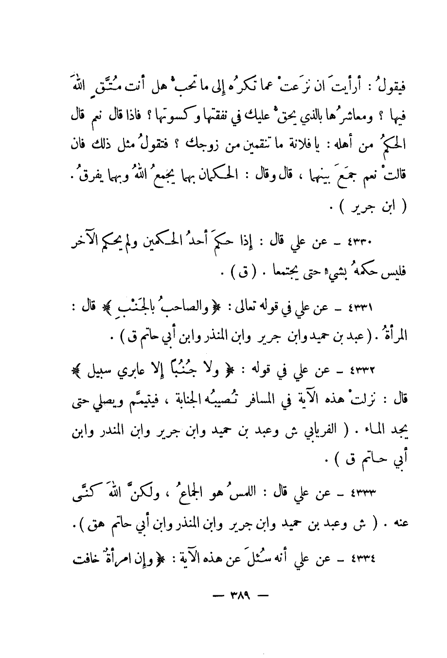 4332 - عن علي في قوله: {وَلا جُنُباً إِلَّا عَابِرِي سَبِيلٍ} قال: "نزلت هذه الآية في المسافر تصيبه الجنابة، فيتيمم ويصلي حتى يجد الماء". "الفرياني ش وعبد بن حميد وابن جرير وابن المنذر وابن أبي حاتم ق".