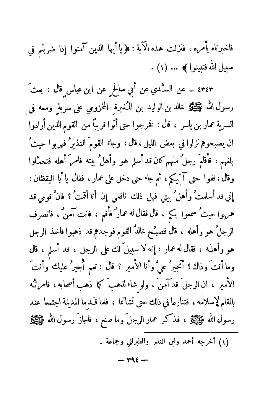 4343- عن السدي عن أبي صالح عن ابن عباس قال: "بعث رسول الله صلى الله عليه وسلم خالد بن الوليد بن المغيرة المخزومي على سرية ومعه في السرية عمار بن ياسر، قال: فخرجوا حتى أتوا قريبا من القوم الذين أرادوا أن يصبحوهم نزلوا في بعض الليل، قال: وجاء القوم النذير فهربوا حيث بلغهم، فأقام رجل منهم كان قد أسلم هو وأهل بيته فأمر أهله فتحملوا وقال: قفوا حتى آتيكم، ثم جاء حتى دخل على عمار، فقال يا أبا اليقظان: إني قد أسلمت وأهل بيتي فهل ذلك نافعي إن أنا أقمت؟ فإن قومي قد هربوا حيث سمعوا بكم، قال فقال له عمار فأقم، فأنت آمن فانصرف الرجل هو وأهله، قال فصبح خالد القوم فوجدهم قد ذهبوا فأخذ الرجل هو وأهله، فقال له عمار: إنه لا سبيل لك على الرجل، قد أسلم، قال وما أنت وذاك؟ أتجير علي وأنا الأمير؟ قال: نعم أجير عليك وأنت الأمير، إن الرجل قد آمن، ولو شاء لذهب كما ذهب أصحابه، فأمرته بالمقام لإسلامه، فتنازعا في ذلك حتى تشاتما، فلما قدما المدينة اجتمعا عند رسول الله صلى الله عليه وسلم، فذكر عمار الرجل وما صنع، فأجاز رسول الله صلى الله عليه وسلم