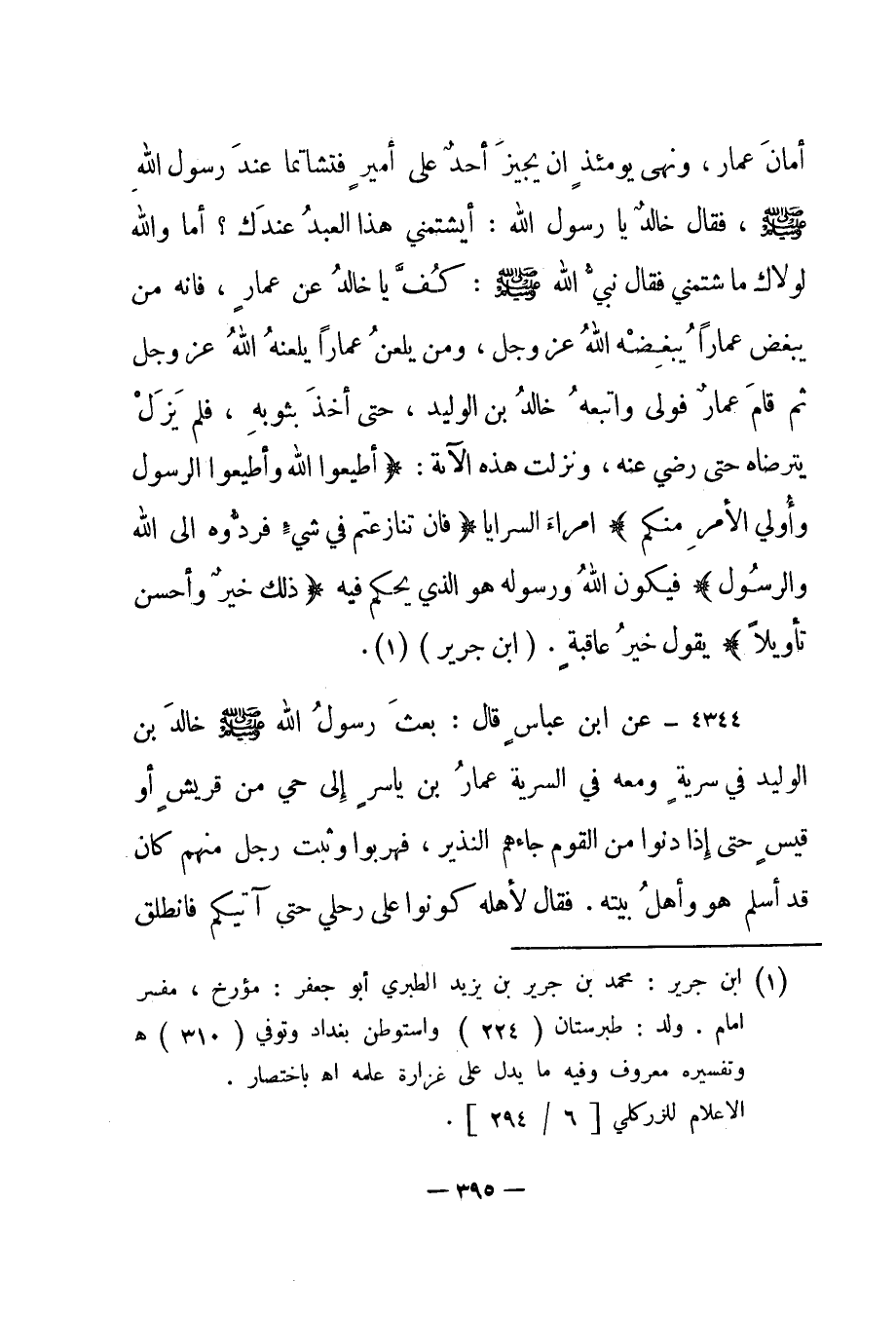 أمان عمار، ونهى يومئذ أن يجيز أحد على أمير فتشاتما عند رسول الله صلى الله عليه وسلم، فقال خالد يا رسول الله: أيشتمني هذا العبد عندك؟ أما والله لولاك ما شتمني فقال نبي الله صلى الله عليه وسلم: كف يا خالد عن عمار، فإنه من يبغض عمارا يبغضه الله عز وجل، ومن يلعن عمارا يلعنه الله عز وجل ثم قام عمار فولى واتبعه خالد بن الوليد، حتى أخذ بثوبه، فلم يزل يترضاه حتى رضي عنه، ونزلت هذه الآية: {أَطِيعُوا اللَّهَ وَأَطِيعُوا الرَّسُولَ وَأُولِي الْأَمْرِ مِنْكُمْ} أمراء السرايا {فَإِنْ تَنَازَعْتُمْ فِي شَيْءٍ فَرُدُّوهُ إِلَى اللَّهِ وَالرَّسُولِ} فيكون الله ورسوله هو الذي يحكم فيه {ذَلِكَ خَيْرٌ وَأَحْسَنُ تَأْوِيلاً} يقول خير عاقبة".