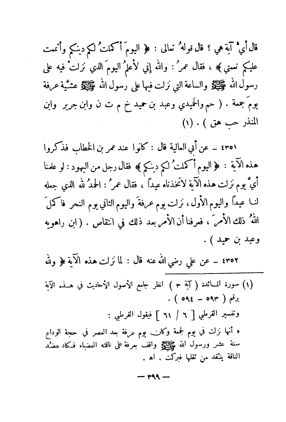 1 سورة المائدة "آية 3" أنظر جامع الأصول الأحاديث في هذه الآية برقم "593 - 594". وتفسير القرطبي [6/61] فيقول القرطبي: