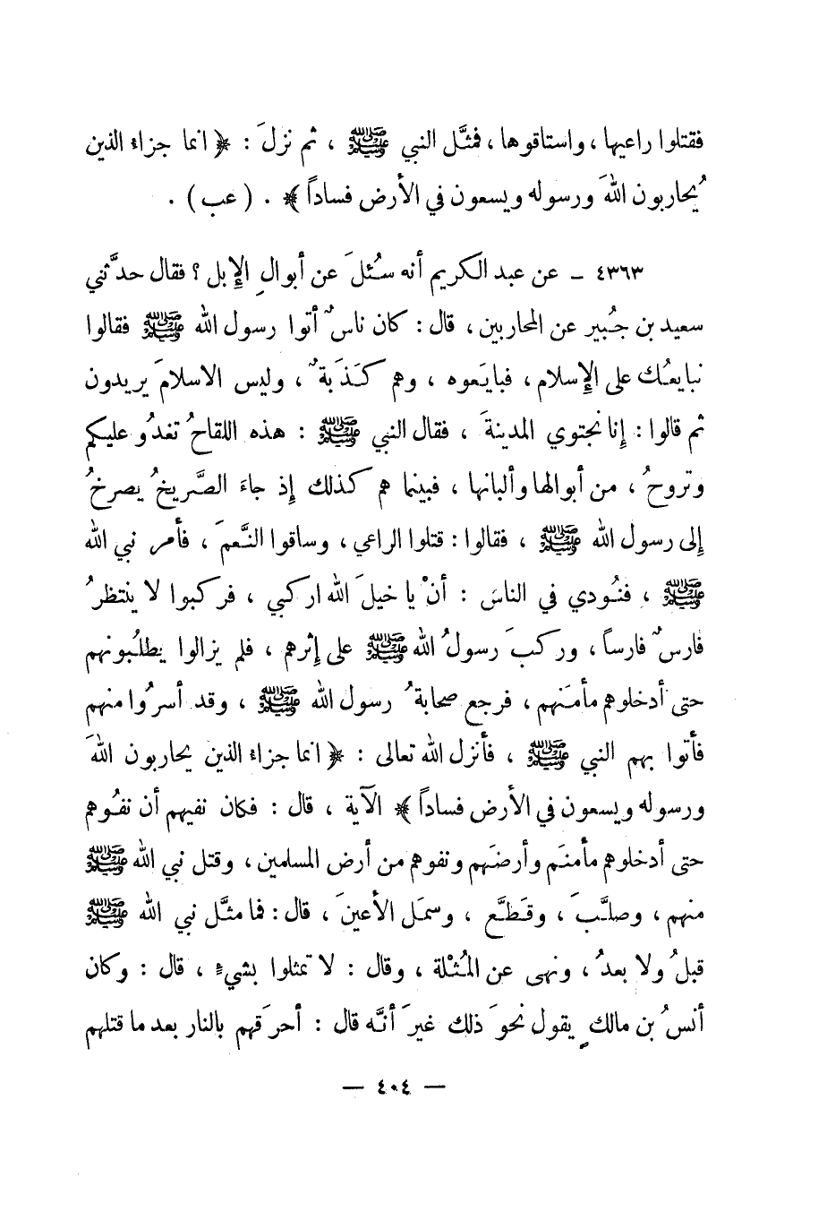 4363- عن عبد الكريم أنه سئل عن أبوال الإبل؟ فقال حدثني سعيد بن جبير عن المحاربين، قال: "كان ناس أتوا رسول الله صلى الله عليه وسلم فقالوا نبايعك على الإسلام، فبايعوه، وهم كذبة، وليس الإسلام يريدون ثم قالوا: إنا نجتوي المدينة، فقال النبي صلى الله عليه وسلم: هذه اللقاح تغدو عليكم وتروح، من أبوالها وألبانها، فبينما هم كذلك إذ جاء الصريخ يصرخ إلى رسول الله صلى الله عليه وسلم، فقالوا: قتلوا الراعي، وساقوا النعم، فأمر نبي الله صلى الله عليه وسلم، فنودي في الناس: أن يا خيل الله اركبي، فركبوا لا ينتظر فارس فارسا، وركب رسول الله صلى الله عليه وسلم على إثرهم، فلم يزالوا يطلبونهم حتى أدخلوهم مأمنهم، فرجع صحابة رسول الله صلى الله عليه وسلم، وقد أسروا منهم فأتوا بهم النبي صلى الله عليه وسلم، فأنزل الله تعالى: {إِنَّمَا جَزَاءُ الَّذِينَ يُحَارِبُونَ اللَّهَ وَرَسُولَهُ وَيَسْعَوْنَ فِي الْأَرْضِ فَسَاداً} الآية، قال: فكان نفيهم أن نفوهم حتى أدخلوهم مأمنهم وأرضهم ونفوهم من أرض المسلمين، وقتل نبي الله صلى الله عليه وسلم منهم، وصلب، وقطع، وسمل الأعين، قال: فما مثل نبي الله صلى الله عليه وسلم قبل ولا بعد، ونهى عن المثلة، وقال: لا تمثلوا بشيء، قال: وكان أنس بن مالك يقول نحو ذلك غير أنه قال: أحرقهم بالنار بعد ما قتلهم