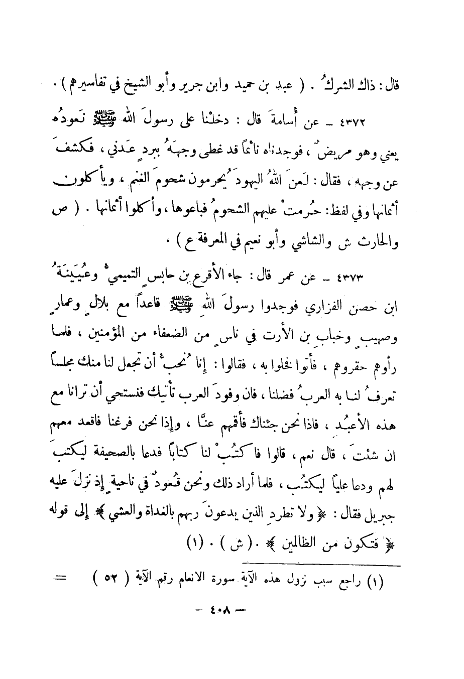4373- عن عمر قال: "جاء الأقرع بن حابس التميمي وعيينة بن حصن الفزاري فوجدوا رسول الله صلى الله عليه وسلم قاعدا مع بلال وعمار وصهيب وخباب بن الأرت في ناس من الضعفاء من المؤمنين، فلما رأوهم حقروهم، فأتوا فخلوا به، فقالوا: إنا نحب أن تجعل لنا منك مجلسا تعرف لنا به العرب فضلنا، فإن وفود العرب تأتيك فنستحي أن ترانا مع هذه الأعبد، فإذا نحن جئناك فأقمهم عنا، وإذا نحن فرغنا فاقعد معهم إن شئت، قال نعم، قالوا فاكتب لنا كتابا فدعا بالصحيفة ليكتب لهم ودعا عليا ليكتب، فلما أراد ذلك ونحن قعود في ناحية إذ نزل عليه جبريل فقال: {وَلا تَطْرُدِ الَّذِينَ يَدْعُونَ رَبَّهُمْ بِالْغَدَاةِ وَالْعَشِيِّ} إلى قوله {فَتَكُونَ مِنَ الظَّالِمِينَ} ". "ش"1.