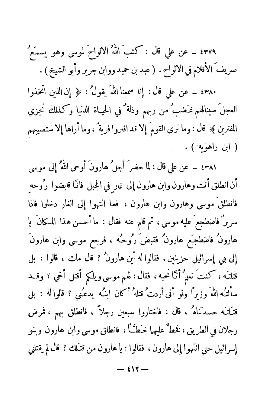 4381- عن علي قال: "لما حضر أجل هارون أوحى الله إلى موسى أن انطلق أنت وهارون وابن هارون إلى غار في الجبل فإنا قابضوا روحه فانطلق موسى وهارون وابن هارون، فلما انتهوا إلى الغار دخلوا فإذا سرير فاضطجع عليه موسى، ثم قام عنه فقال: ما أحسن هذا المكان يا هارون فاضطجع هارون فقبض روحه، فرجع موسى وابن هارون إلى بني إسرائيل حزينين، فقالوا له أين هارون؟ قال مات، قالوا: بل قتلته، كنت تعلم أنا نحبه، فقال لهم موسى: ويلكم أقتل أخي؟ وقد سألته الله وزيرا ولو أنى أردت قتله أكان ابنه يدعني؟ قالوا له: بل قتلته حسدتناه، قال: فاختاروا سبعين رجلا، فانطلق بهم، فمرض رجلان في الطريق، فحط عليهما خطا، فانطلق موسى وابن هارون وبنو إسرائيل حتى انتهوا إلى هارون، فقالوا: يا هارون من قتلك؟ قال لم يقتلني