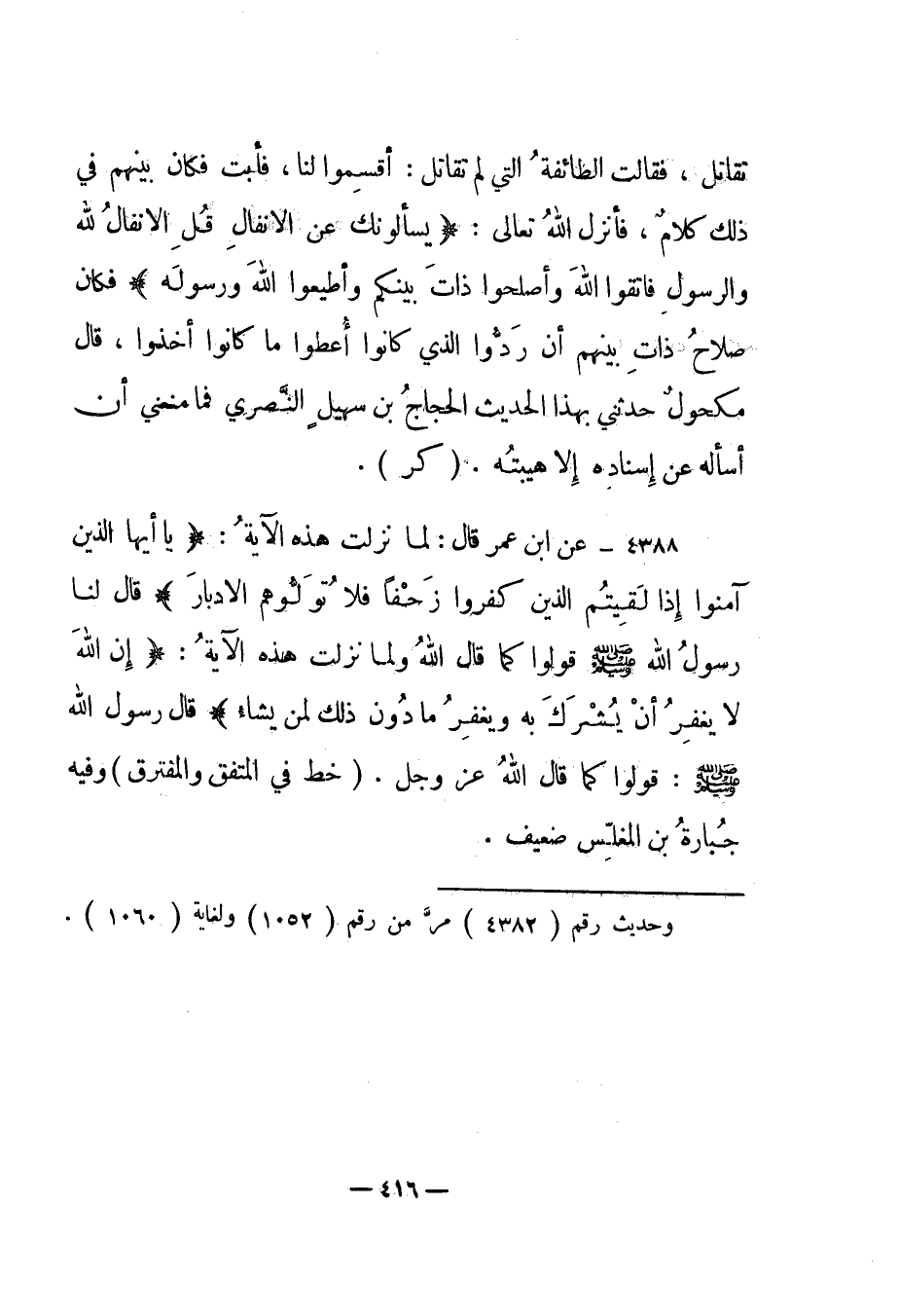 4388- عن ابن عمر قال: لما نزلت هذه الآية: {يَا أَيُّهَا الَّذِينَ آمَنُوا إِذَا لَقِيتُمُ الَّذِينَ كَفَرُوا زَحْفاً فَلا تُوَلُّوهُمُ الْأَدْبَارَ} قال لنا رسول الله صلى الله عليه وسلم قولوا كما قال الله ولما نزلت هذه الآية: {إِنَّ اللَّهَ لا يَغْفِرُ أَنْ يُشْرَكَ بِهِ وَيَغْفِرُ مَا دُونَ ذَلِكَ لِمَنْ يَشَاءُ} قال رسول الله صلى الله عليه وسلم: "قولوا كما قال الله عز وجل". "خط في المتفق والمفترق" وفيه جبارة بن المغلس ضعيف.