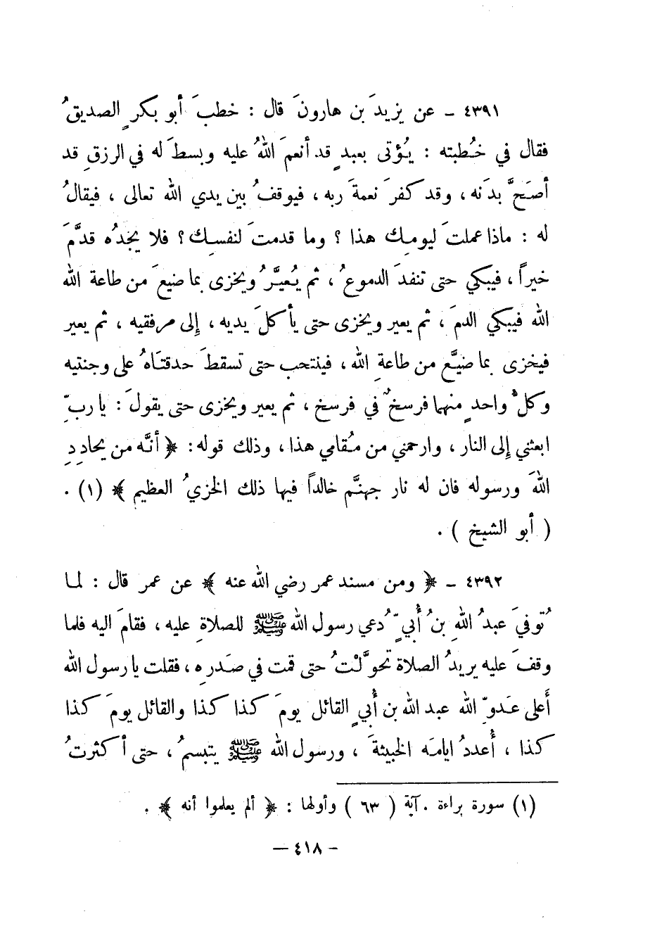 4391- عن يزيد بن هارون قال: خطب أبو بكر الصديق فقال في خطبته: "يؤتى بعبد قد أنعم الله عليه وبسط له في الرزق قد أصح بدنه، وقد كفر نعمة ربه، فيوقف بين يدي الله تعالى، فيقال له: ماذا عملت ليومك هذا؟ وما قدمت لنفسك؟ فلا يجده قدم خيرا، فيبكي حتى تنفد الدموع، ثم يعير ويخزى بما ضيع من طاعة الله فيبكي الدم، ثم يعير ويخزى حتى يأكل يديه، إلى مرفقيه، ثم يعير فيخزى بما ضيع من طاعة الله، فينتحب حتى تسقط حدقتاه على وجنتيه وكل واحد منهما فرسخ في فرسخ، ثم يعير ويخزى حتى يقول: يا رب ابعثني إلى النار، وارحمني من مقامي هذا"، وذلك قوله: {أَنَّهُ مَنْ يُحَادِدِ اللَّهَ وَرَسُولَهُ فَأَنَّ لَهُ نَارَ جَهَنَّمَ خَالِداً فِيهَا ذَلِكَ الْخِزْيُ الْعَظِيمُ} 1."أبو الشيخ".