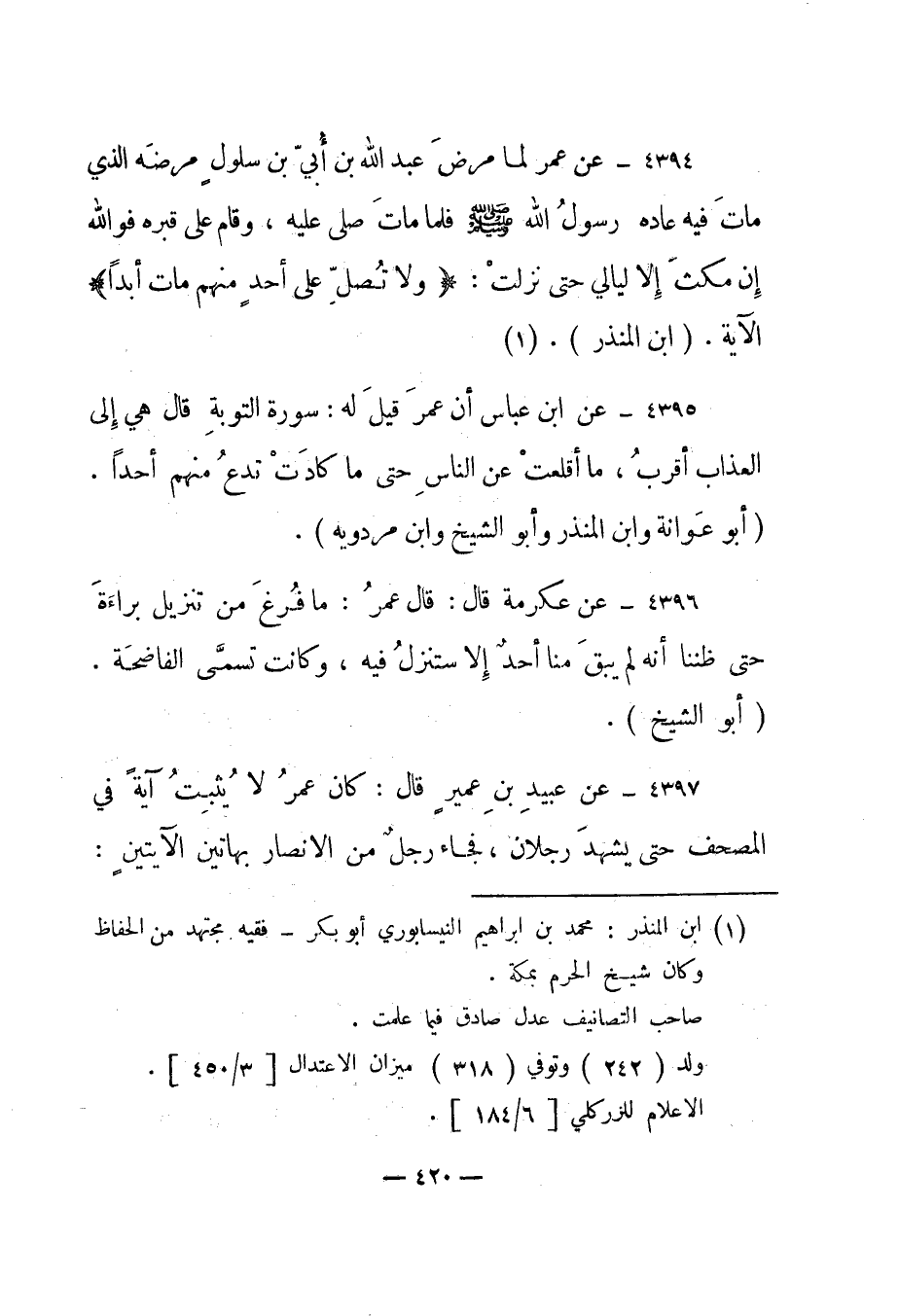 4394- عن عمر "لما مرض عبد الله بن أبي سلول مرضه الذي مات فيه عاده رسول الله صلى الله عليه وسلم فلما مات صلى عليه، وقام على قبره فوالله إن مكث إلا ليالي" حتى نزلت: {وَلا تُصَلِّ عَلَى أَحَدٍ مِنْهُمْ مَاتَ أَبَداً} الآية. "ابن المنذر"1.