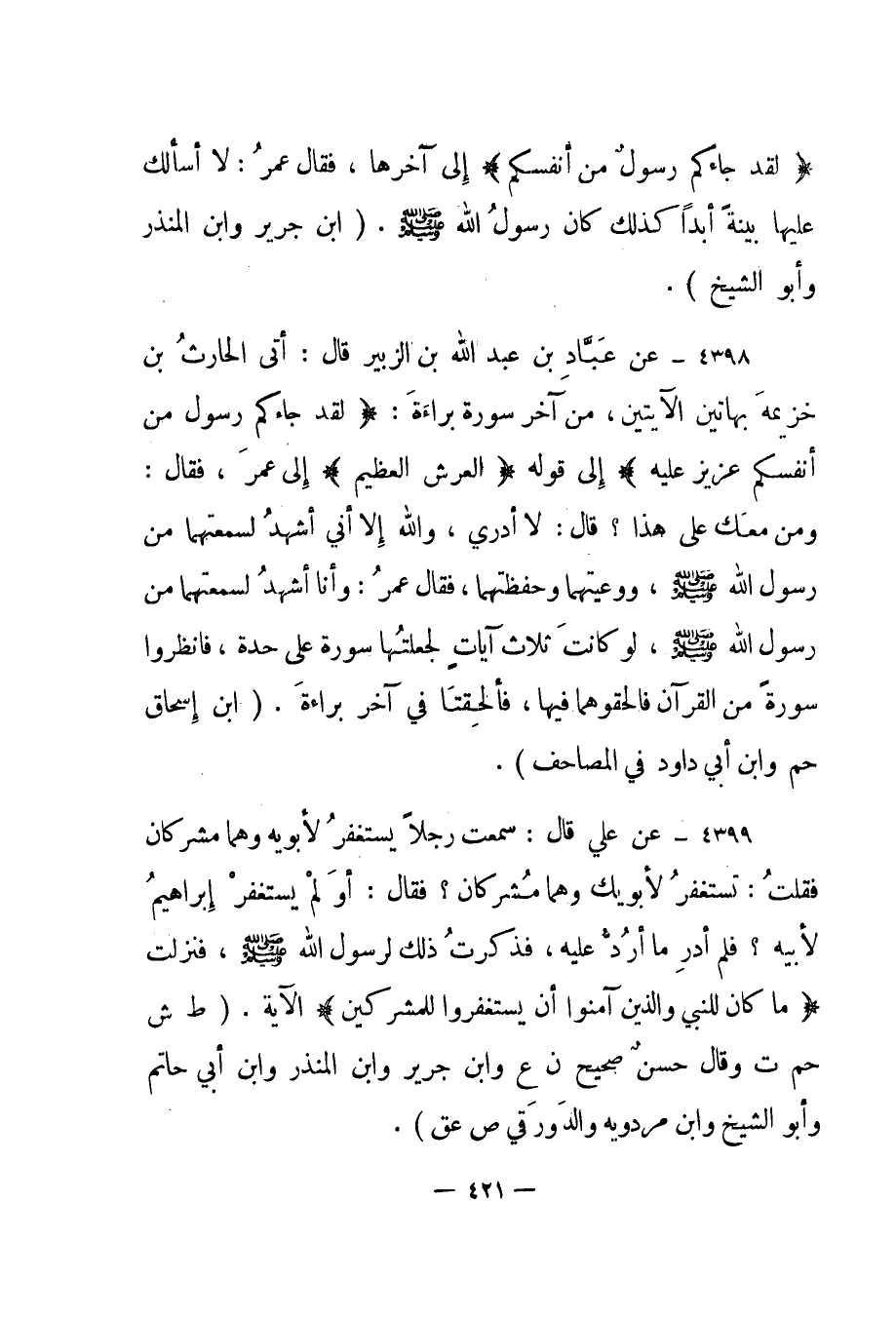 4398- عن عباد بن عبد الله بن الزبير قال: "أتى الحارث بن خزيمه بهاتين الآيتين، من آخر سورة براءة: {لَقَدْ جَاءَكُمْ رَسُولٌ مِنْ أَنْفُسِكُمْ عَزِيزٌ عَلَيْهِ} إلى قوله {الْعَرْشِ الْعَظِيمِ} إلى عمر، فقال: ومن معك على هذا؟ قال: لا أدري، والله إلا أني أشهد لسمعتهما من رسول الله صلى الله عليه وسلم، ووعيتهما وحفظتهما، فقال عمر: وأنا أشهد لسمعتهما من رسول الله صلى الله عليه وسلم، لو كانت ثلاث آيات لجعلتها سورة على حدة. فانظروا سورة من القرآن فالحقوهما فيها، فألحقتا في آخر براءة". "ابن إسحاق حم وابن أبي داود في المصاحف".