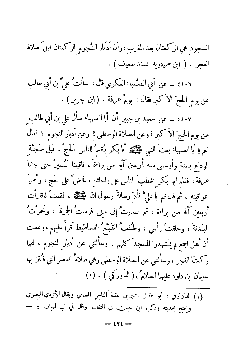 4407- عن سعيد بن جبير أن أبا الصهباء سأل علي بن أبي طالب عن يوم الحج الأكبر؟ وعن الصلاة الوسطى؟ وعن أدبار النجوم؟ فقال نعم يا أبا الصهباء بعث النبي صلى الله عليه وسلم أبا بكر يقيم للناس الحج، قبل حجة الوداع بسنة وأرسلني معه بأربعين آية من براءة، فأقبلنا نسير حتى جئنا عرفة، فقام أبو بكر فخطب الناس على راحلته، فحض على الحج، وأمر بمواقيته، ثم قال قم يا علي فأد رسالة رسول الله صلى الله عليه وسلم، فقمت فاقترأت أربعين آية من براءة، ثم صدرت إلى منى فرميت الجمرة، ونحرت البدنة، وحلقت رأسي، وطفت أتتبع الفساطيط أقرأ عليهم، وعلمت أن أهل الجمع لم يشهدوا المسجد كلهم، وسألتني عن أدبار النجوم، فهما ركعتا الفجر، وسألتني عن الصلاة الوسطى وهي صلاة العصر التي فتن بها سليمان بن داود عليهما السلام. "الدورقي"1.
