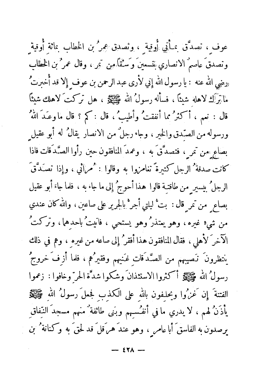 عوف، تصدق بمأتي أوقية، وتصدق عمر بن الخطاب بمائة أوقية وتصدق عاصم الأنصاري بتسعين وسقا من تمر، وقال عمر بن الخطاب رضي الله عنه: يا رسول الله إني لآرى عبد الرحمن بن عوف إلا قد أخبرت ما ترك لأهله شيئا، فسأله رسول الله صلى الله عليه وسلم، هل تركت لأهلك شيئا قال: نعم، أكثر مما أنفقت وأطيب، قال: كم؟ قال ما وعد الله ورسوله من الصدق والخير، وجاء رجل من الأنصار يقال له أبو عقيل بصاع من تمر، فتصدق به، وعمد المنافقون حين رأوا الصدقات فإذا كانت صدقة الرجل كثيرة تغامزوا به وقالوا: مرائي، وإذا تصدق الرجل بيسير من طاقته قالوا هذا أحوج إلى ما جاء به، فلما جاء أبو عقيل بصاع من تمر قال: بت ليلتي أجر بالجرير على صاعين، والله كان عندي من شيء غيره، وهو يعتذر وهو يستحي، فأتيت بأحدهما، وتركت الآخر لأهلي، فقال المنافقون هذا أفقر إلى صاعه من غيره، وهم في ذلك ينتظرون نصيبهم من الصدقات غنيهم وفقيرهم فلما أزف خروج رسول الله صلى الله عليه وسلم أكثروا الإسئذان وشكوا شدة الحر وخافوا: زعموا الفتنة إن غزوا ويحلفون بالله على الكذب فجعل رسول الله صلى الله عليه وسلم يأذن لهم، لا يدري ما في أنفسهم وبنى طائفة منهم مسجد النفاق يرصدون به الفاسق أبا عامر، وهو عند هرقل قد لحق به وكنانة بن