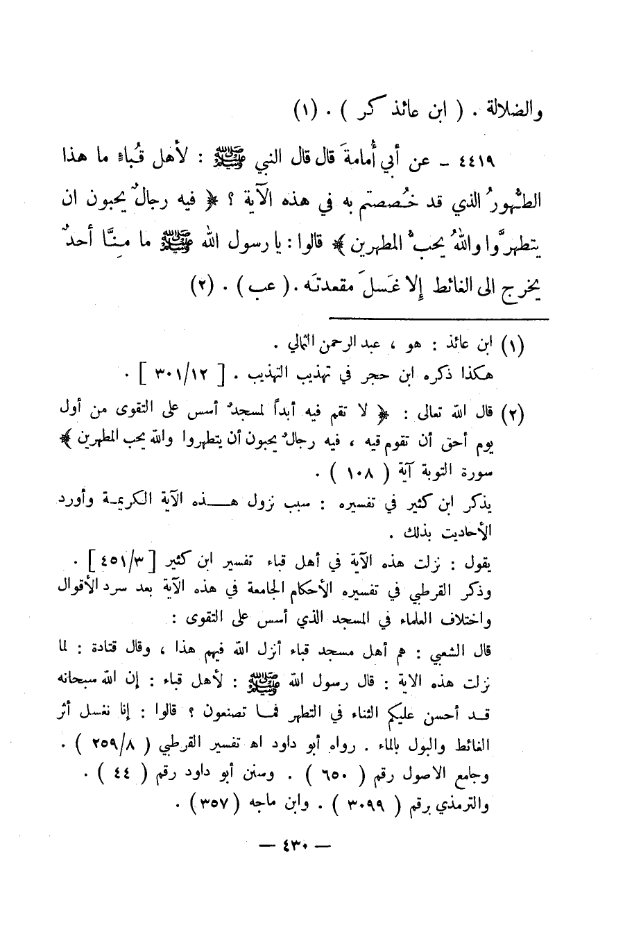 4419- عن أبي أمامة قال قال النبي صلى الله عليه وسلم: لأهل قباء ما هذا الطهور الذي قد خصصتم به في هذه الآية؟ {فِيهِ رِجَالٌ يُحِبُّونَ أَنْ يَتَطَهَّرُوا وَاللَّهُ يُحِبُّ الْمُطَّهِّرِينَ} قالوا: "يا رسول الله صلى الله عليه وسلم ما منا أحد يخرج إلى الغائط إلا غسل مقعدته". "عب"2.