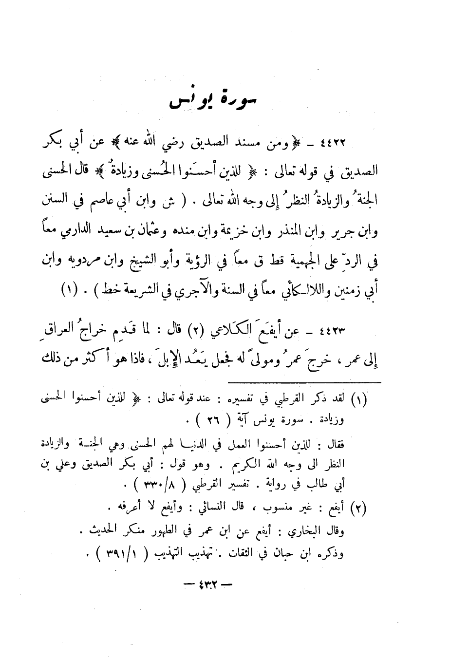 4422- "ومن مسند الصديق رضي الله عنه" عن أبي بكر الصديق في قوله تعالى: {لِلَّذِينَ أَحْسَنُوا الْحُسْنَى وَزِيَادَةٌ} قال "الحسنى الجنة والزيادة النظر إلى وجه الله تعالى". "ش وابن أبي عاصم في السنن وابن جرير وابن المنذر وابن خزيمة وابن منده وعثمان بن سعيد الدارمي معا في الرد على الجهمية قط ق معا في الرؤية وأبو الشيخ وابن مردويه وابن أبي زمنين واللالكائي معا في السنة والآجري في الشريعة خط"1.