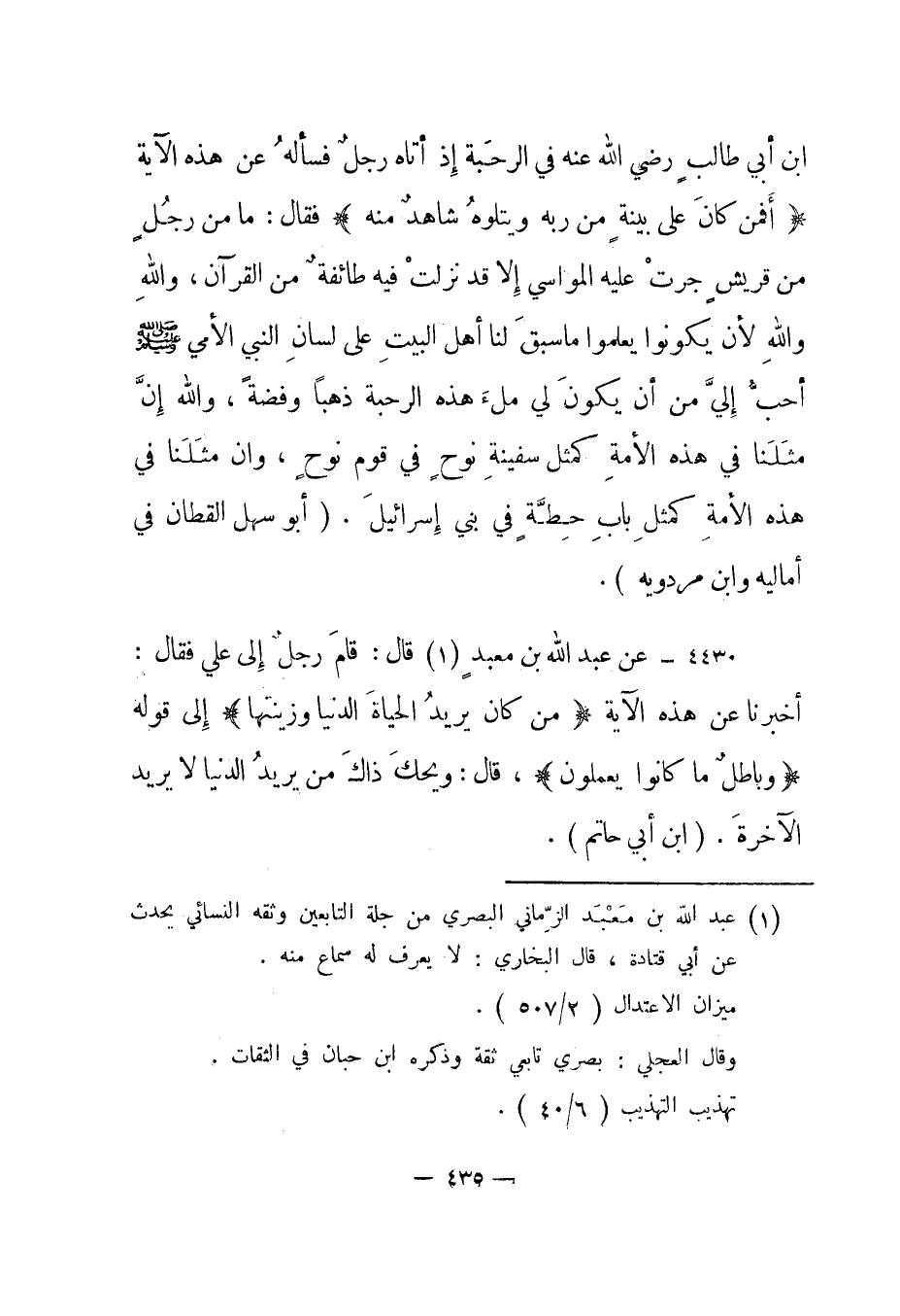 4430- عن عبد الله بن معبد1 قال: "قام رجل إلى علي فقال: أخبرنا عن هذه الآية {مَنْ كَانَ يُرِيدُ الْحَيَاةَ الدُّنْيَا وَزِينَتَهَا} إلى قوله {وَبَاطِلٌ مَا كَانُوا يَعْمَلُونَ} ، قال: ويحك ذاك من يريد الدنيا لا يريد الآخرة". "ابن أبي حاتم".