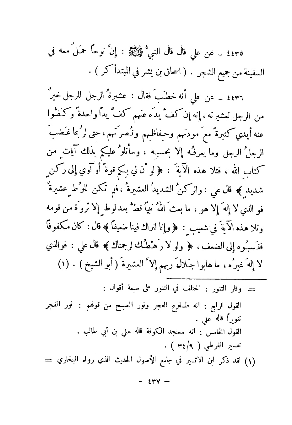 4436- عن علي أنه خطب فقال: "عشيرة الرجل للرجل خير من الرجل لعشيرته، إنه إن كف يده عنهم كف يدا واحدة وكفوا عنه أيدي كثيرة مع مودتهم وحفاظهم ونصرتهم، حتى لربما غضب الرجل للرجل وما يعرفه إلا بحسبه، وسأتلوا عليكم بذلك آيات من كتاب الله، فتلا هذه الآية: {لَوْ أَنَّ لِي بِكُمْ قُوَّةً أَوْ آوِي إِلَى رُكْنٍ شَدِيدٍ} قال علي: والركن الشديد العشيرة، فلم تكن للوط عشيرة فو الذي لا إله إلا هو، ما بعث الله نبيا قط بعد لوط إلا ثروة من قومه وتلا هذه الآية في شعيب: {وَإِنَّا لَنَرَاكَ فِينَا ضَعِيفاً} قال: كان مكفوفا فنسبوه إلى الضعف، {وَلَوْلا رَهْطُكَ لَرَجَمْنَاكَ} قال علي: فو الذي لا إله غيره، ما هابوا جلال ربهم إلا العشيرة. "أبو الشيخ"1.