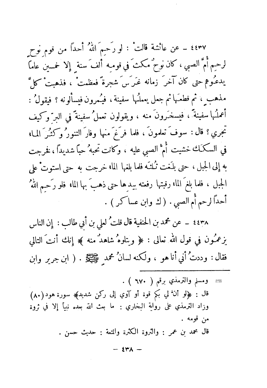 4437 - عن عائشة قالت: "لو رحم الله أحدا من قوم نوح لرحم أم الصبي، كان نوح مكث في قومه ألف سنة إلا خمسين عاما يدعوهم حتى كان آخر زمانه غرس شجرة فعظمت، فذهبت كل مذهب، ثم قطعها ثم جعل يعملها سفينة، فيمرون فيسألونه؟ فيقول: أعملها سفينة، فيسخرون منه، ويقولون تعمل سفينة في البر وكيف تجري؟ قال: سوف تعلمون، فلما فرغ منها وفار التنور وكثر الماء في السكك خشيت أم الصبي عليه، وكانت تحبه حبا شديدا، فخرجت به إلى الجبل، حتى بلغت ثلثه فلما بلغها الماء خرجت به حتى استوت على الجبل، فلما بلغ الماء رقبتها رفعته بيدها حتى ذهب بها الماء فلو رحم الله أحدا لرحم أم الصبي". "ك وابن عساكر".