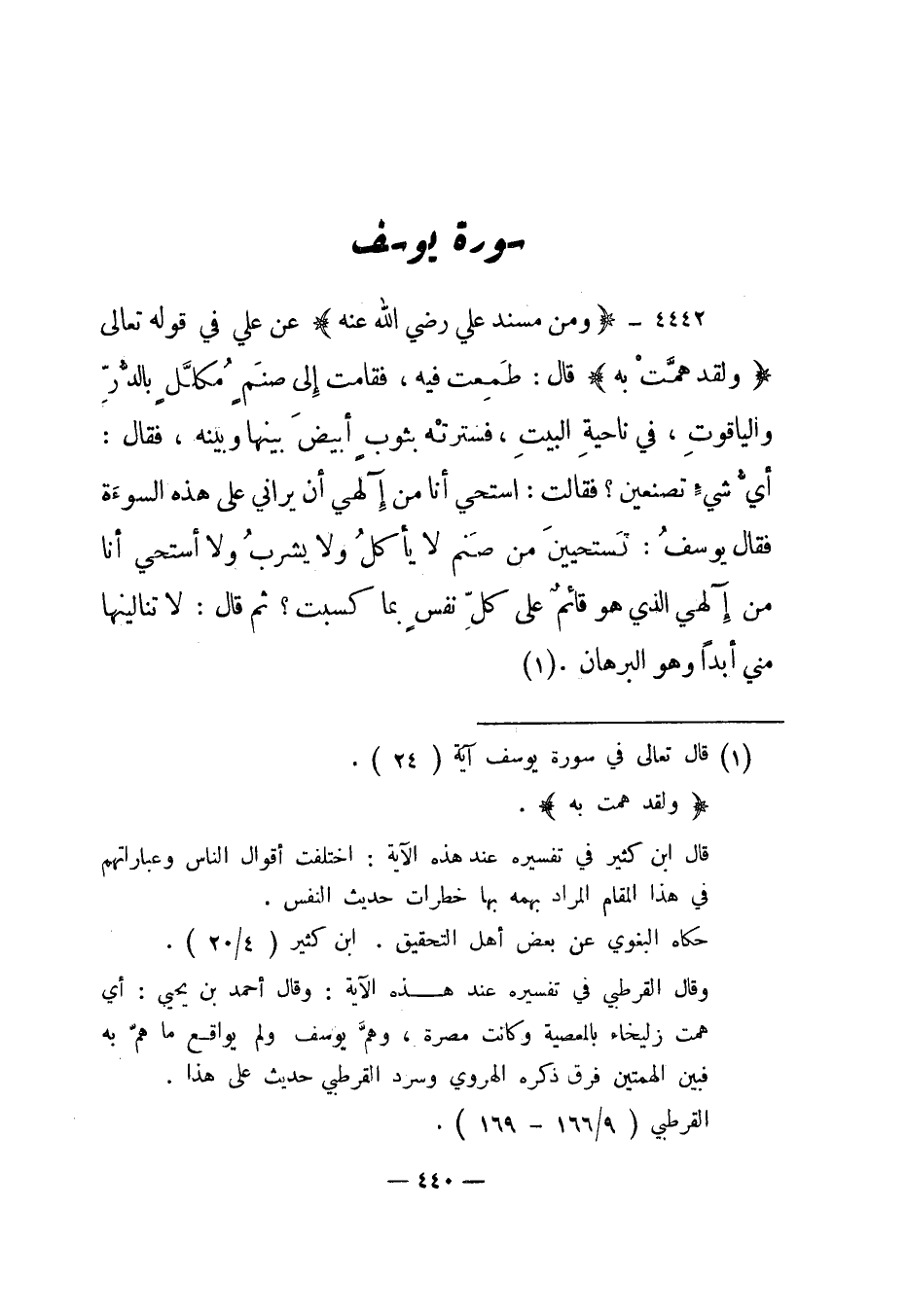 4442- "ومن مسند علي رضي الله عنه" عن علي في قوله تعالى {وَلَقَدْ هَمَّتْ بِهِ} قال: "طمعت فيه، فقامت إلى صنم مكلل بالدر والياقوت، في ناحية البيت، فسترته بثوب أبيض بينها وبينه، فقال: أي شيء تصنعين؟ فقالت: أستحي أنا من إلهي أن يراني على هذه السوءة فقال يوسف: تستحيين من صنم لا يأكل ولا يشرب ولا أستحي أنا من إلهي الذي هو قائم على كل نفس بما كسبت؟ ثم قال: لا تنالينها مني أبدا وهو البرهان"1.