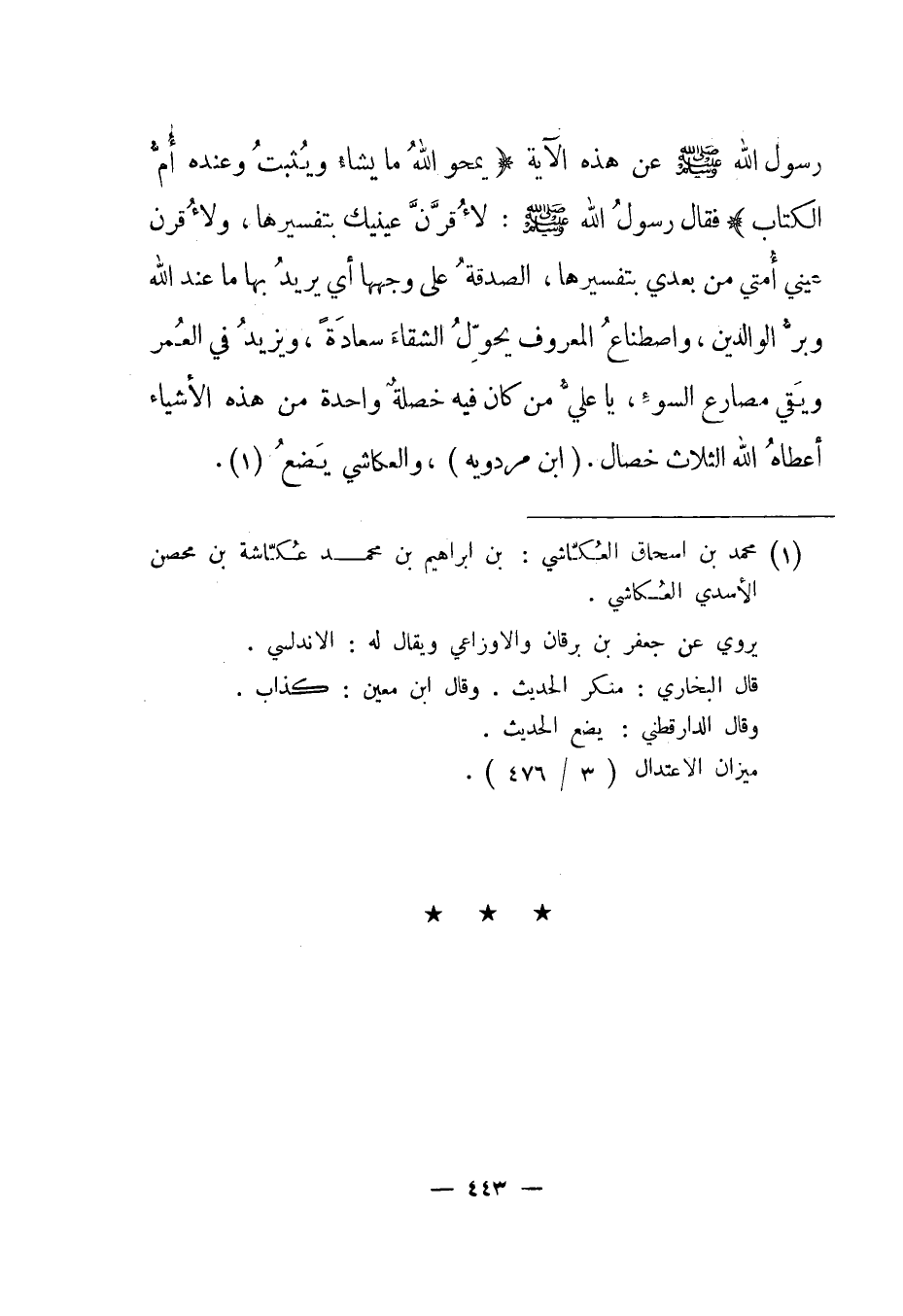 رسول الله صلى الله عليه وسلم عن هذه الآية {يَمْحُوا اللَّهُ مَا يَشَاءُ وَيُثْبِتُ وَعِنْدَهُ أُمُّ الْكِتَابِ} فقال رسول الله صلى اله عليه وسلم: "لأقرن عينيك بتفسيرها، ولأقرن عيني أمتي من بعدي بتفسيرها، الصدقة على وجهها أي يريد بها ما عند الله وبر الوالدين، واصطناع المعروف يحول الشقاء سعادة، ويزيد في العمر ويقي مصارع السوء، يا علي من كان فيه خصلة واحدة من هذه الأشياء أعطاه الله الثلاث خصال". "ابن مردويه"، والعكاشي يضع1.