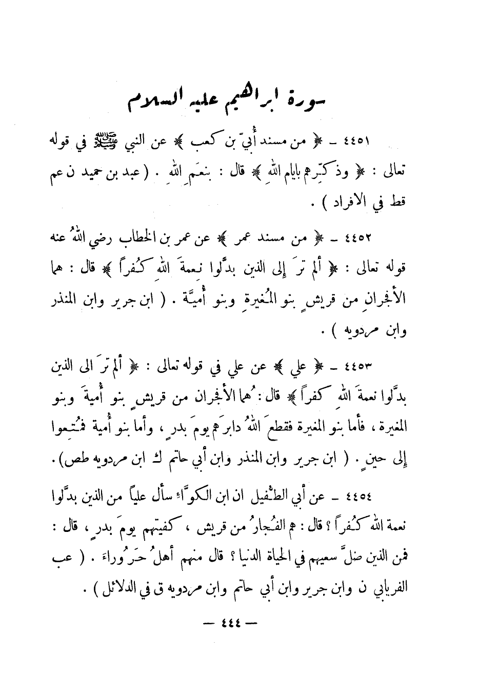 4452- "من مسند عمر" عن عمر بن الخطاب رضي الله عنه قوله تعالى: {أَلَمْ تَرَ إِلَى الَّذِينَ بَدَّلُوا نِعْمَتَ اللَّهِ كُفْراً} قال: "هما الأفجران من قريش بنو المغيرة وبنو أمية" "ابن جرير وابن المنذر وابن مردويه".
