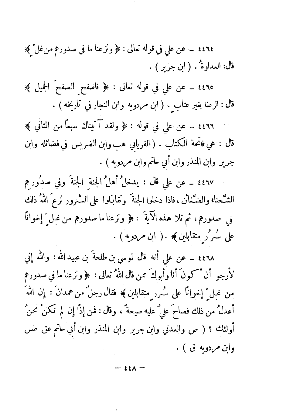 4467- عن علي قال: "يدخل أهل الجنة الجنة وفي صدورهم الشحناء والضغائن، فإذا دخلوا الجنة وتقابلوا على السرر نزع الله ذلك في صدورهم، ثم تلا هذه الآية: {وَنَزَعْنَا مَا فِي صُدُورِهِمْ مِنْ غِلٍّ إِخْوَاناً عَلَى سُرُرٍ مُتَقَابِلِينَ} . "ابن مردويه".
