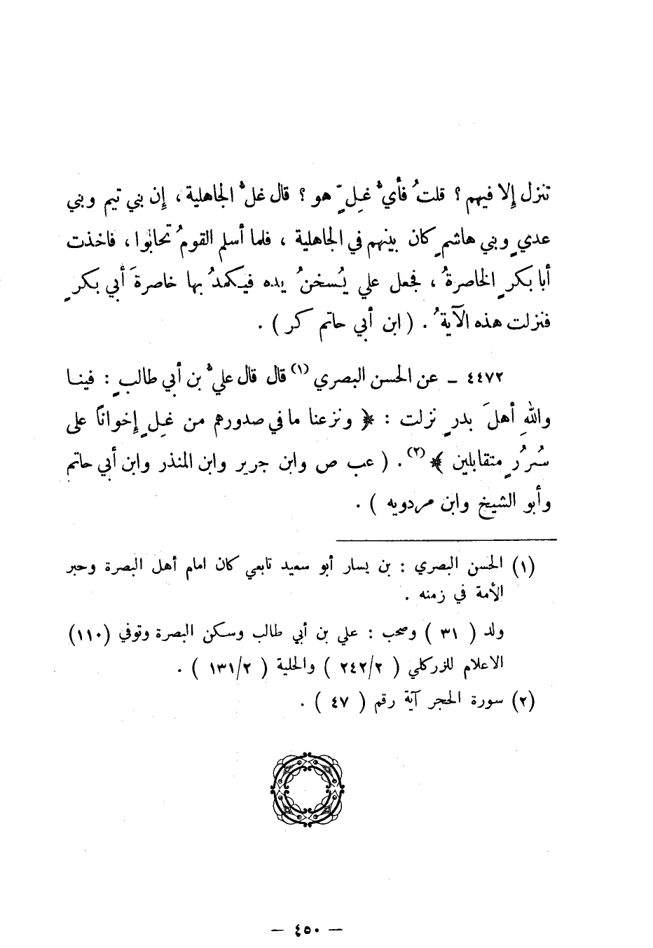4472- عن الحسن البصري1 قال قال علي بن أبي طالب: "فينا والله أهل بدر نزلت: {وَنَزَعْنَا مَا فِي صُدُورِهِمْ مِنْ غِلٍّ إِخْوَاناً عَلَى سُرُرٍ مُتَقَابِلِينَ} 2. "عب ص وابن جرير وابن المنذر وابن أبي حاتم وأبو الشيخ وابن مردويه".