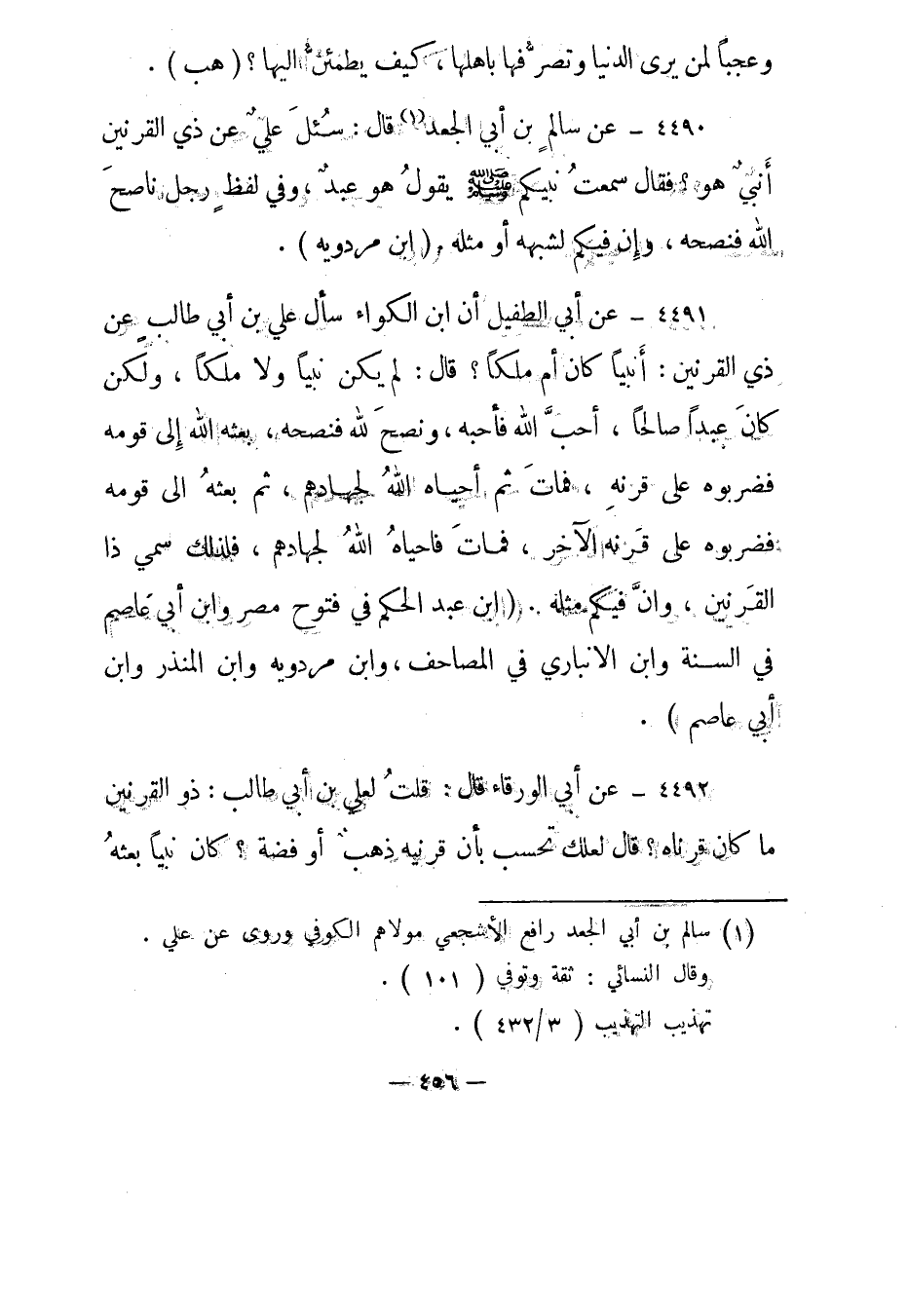 4490- عن سالم بن أبي الجعد1 قال: سئل علي عن ذي القرنين أنبي هو؟ فقال "سمعت نبيكم صلى الله عليه وسلم يقول هو عبد، وفي لفظ رجل ناصح الله فنصحه، وإن فيكم لشبهه أو مثله ". "ابن مردويه".