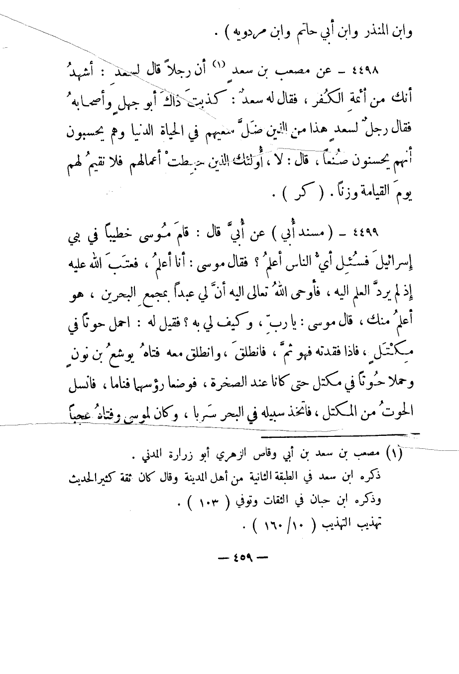 4499- "مسند أبي" عن أبي قال: "قام موسى خطيبا في بني إسرائيل فسئل أي الناس أعلم؟ فقال موسى: أنا أعلم، فعتب الله عليه إذ لم يرد العلم إليه؟ فأوحى الله تعالى إليه أن لي عبدا بمجمع البحرين، هو أعلم منك، قال موسى: يا رب، وكيف لي به؟ فقيل له: احمل حوتا في مكتل، فاذا فقدته فهو ثم، فانطلق، وانطلق معه فتاه يوشع بن نون وحملا حوتا في مكتل حتى كانا عند الصخرة، فوضعا رؤسها فناما، فانسل الحوت من المكتل، فاتخذ سبيله في البحر سربا، وكان لموسى وفتاه عجبا