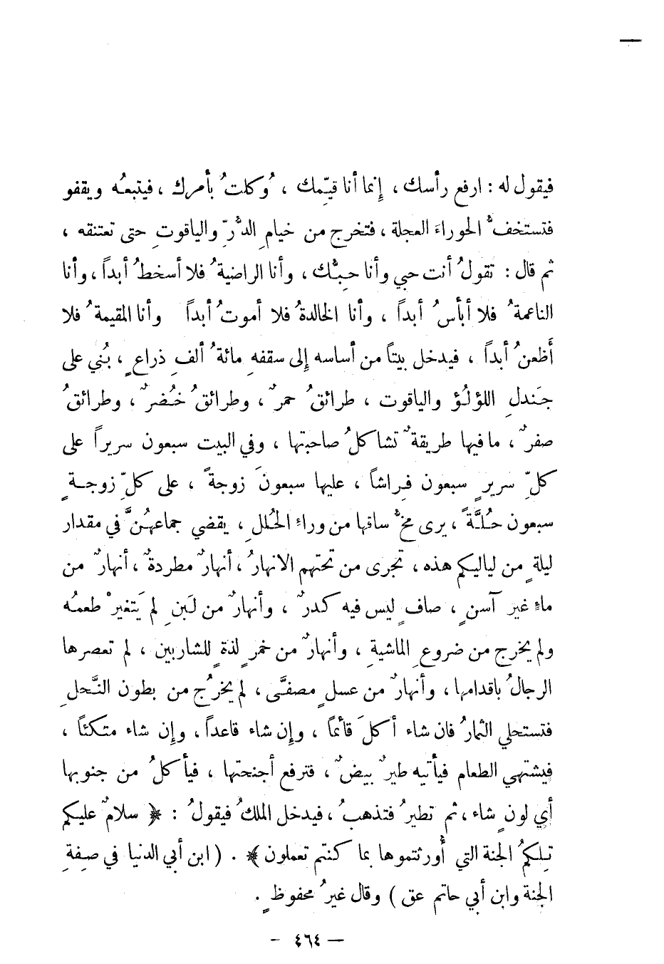 فيقول له: ارفع رأسك، إنما أنا قيمك، وكلت بأمرك، فيتبعه ويقفو فتستخف الحوراء العجلة، فتخرج من خيام الدر والياقوت حتى تعتنقه، ثم قال: تقول أنت حبي وأنا حبك، وأنا الراضية فلا أسخط أبدا، وأنا الناعمة فلا أبأس أبدا، وأنا الخالدة فلا أموت أبدا، وأنا المقيمة فلا أظعن أبدا، فيدخل بيتا من أساسه إلى سقفه مائة ألف ذراع، بني على جندل اللؤلؤ والياقوت، طرائق حمر، وطرائق خضر، وطرائق صفر، ما فيها طريقة تشاكل صاحبتها، وفي البيت سبعون سريرا على كل سرير سبعون فراشا، عليها سبعون زوجة، على كل زوجة سبعون حلة، يرى مخ ساقها من وراء الحلل، يقضي جماعهن في مقدار ليلة من لياليكم هذه، تجري من تحتهم الأنهار، أنهار مطردة، أنهار من ماء غير آسن، صاف ليس فيه كدر، وأنهار من لبن لم يتغير طعمه ولم يخرج من ضروع الماشية، وأنهار من خمر لذة للشاربين، لم تعصرها الرجال بأقدامها، وأنهار من عسل مصفى، لم يخرج من بطون النحل فتستحلي الثمار فإن شاء أكل قائما، وإن شاء قاعدا، وإن شاء متكئا، فيشتهي الطعام فيأتيه طير بيض، فترفع أجنحتها، فيأكل من جنوبها أي لون شاء، ثم تطير فتذهب، فيدخل الملك فيقول: {سَلامٌ عَلَيْكُمُ} {تِلْكُمُ الْجَنَّةُ أُورِثْتُمُوهَا بِمَا كُنْتُمْ تَعْمَلُونَ} . "ابن أبي الدنيا في صفة الجنة وابن أبي حاتم عق". وقال غير محفوظ".