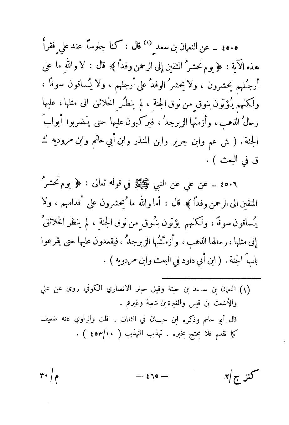 4505- عن النعمان بن سعد1 قال: "كنا جلوسا عند علي فقرأ هذه الآية: {يَوْمَ نَحْشُرُ الْمُتَّقِينَ إِلَى الرَّحْمَنِ وَفْداً} قال: لا والله ما على أرجلهم يحشرون، ولا يحشر الوفد على أرجلهم، ولا يساقون سوقا، ولكنهم يؤتون بنوق من نوق الجنة، لم ينظر الخلائق إلى مثلها، عليها رحال الذهب، وأزمتها الزبرجد، فيركبون عليها حتى يضربوا أبواب الجنة". "ش عم وابن جرير وابن المنذر وابن أبي حاتم وابن مروديه ك ق في البعث".