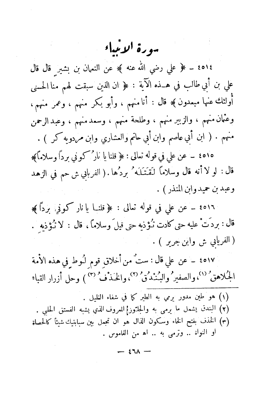 4516- عن علي في قوله تعالى: {قُلْنَا يَا نَارُ كُونِي بَرْداً} قال: "بردت عليه حتى كادت تؤذيه حتى قيل وسلاما، قال: لا تؤذيه". "الفريابي ش وابن جرير".