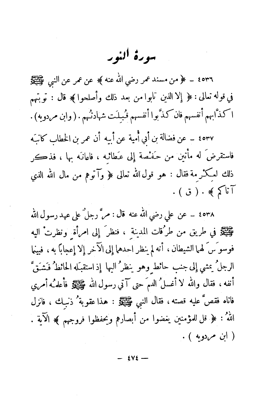 4538- عن علي رضي الله عنه قال: "مر رجل على عهد رسول الله صلى الله عليه وسلم في طريق من طرقات المدينة، فنظر إلى امرأة ونظرت إليه فوسوس لهما الشيطان، أنه لم ينظر أحدهما إلى الآخر إلا إعجابا به، فبينما الرجل يمشي إلى جنب حائط وهو ينظر إليها إذ استقبله الحائط فشق أنفه، فقال والله لا أغسل الدم حتى آتي رسول الله صلى الله عليه وسلم فأعلمه أمري فأتاه فقص عليه قصته، فقال النبي صلى الله عليه وسلم: هذا عقوبة ذنبك، فأنزل الله: {قُلْ لِلْمُؤْمِنِينَ يَغُضُّوا مِنْ أَبْصَارِهِمْ وَيَحْفَظُوا فُرُوجَهُمْ} " الآية."ابن مردويه".