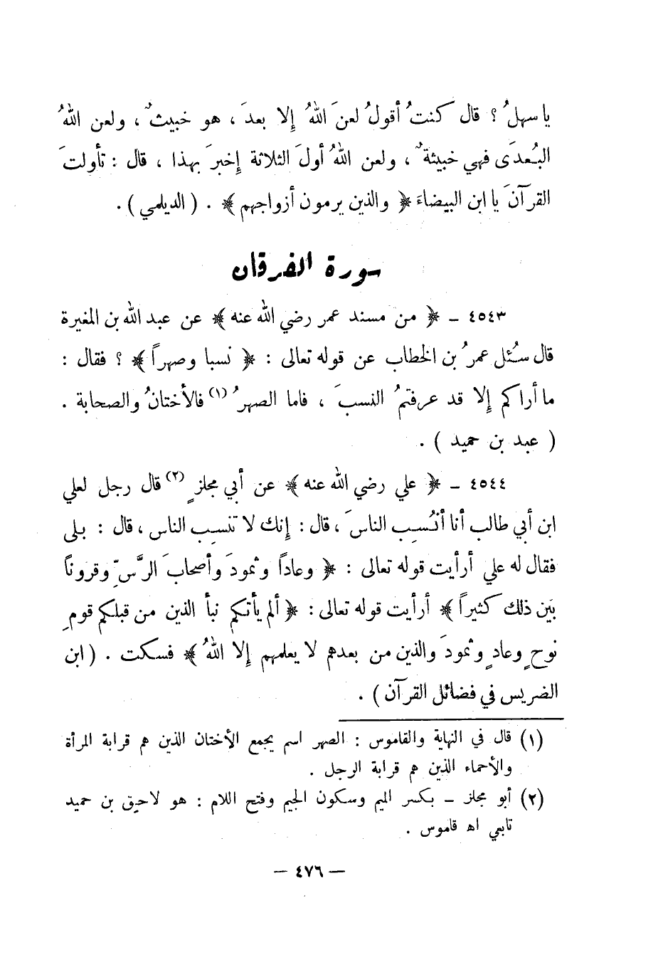 4543- "من مسند عمر رضي الله عنه" عن عبد الله بن المغيرة قال "سئل عمر بن الخطاب عن قوله تعالى: {نَسَباً وَصِهْراً} ؟ فقال: ما أراكم إلا قد عرفتم النسب، فأما الصهر1 فالأختان والصحابة". "عبد بن حميد".