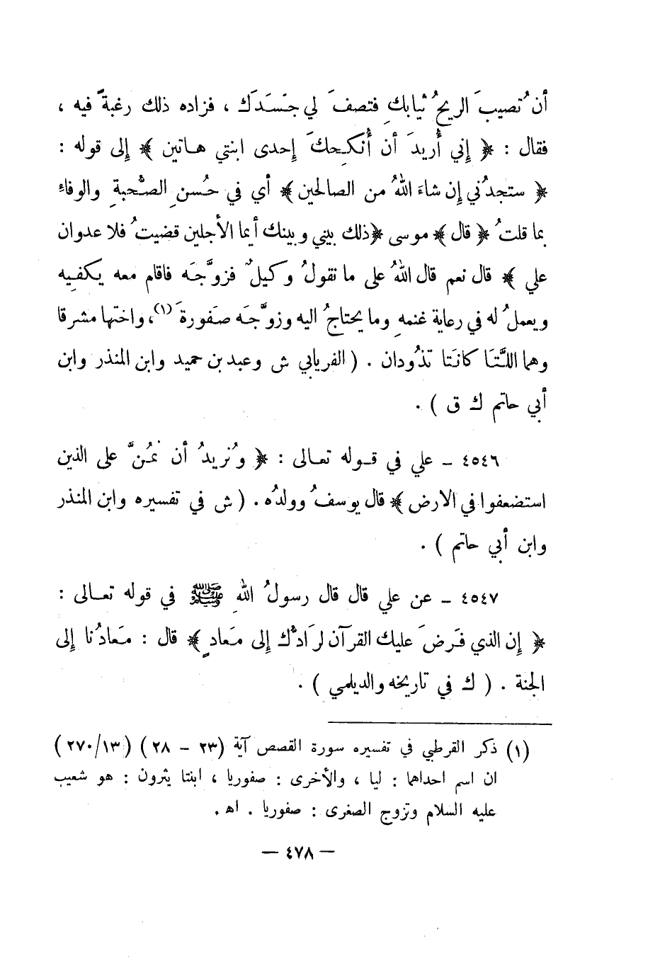 أن تصيب الريح ثيابك فتصف لي جسدك، فزاده ذلك رغبة فيه، فقال: {إِنِّي أُرِيدُ أَنْ أُنْكِحَكَ إِحْدَى ابْنَتَيَّ هَاتَيْنِ} إلى قوله: {إِنِّي أُرِيدُ أَنْ أُنْكِحَكَ إِحْدَى ابْنَتَيَّ هَاتَيْنِ} أي في حسن الصحبة والوفاء بما قلت {قال} موسى {ذَلِكَ بَيْنِي وَبَيْنَكَ أَيَّمَا الْأَجَلَيْنِ قَضَيْتُ فَلا عُدْوَانَ عَلَيَّ} قال نعم قال الله على ما نقول وكيل فزوجه فأقام معه يكفيه ويعمل له في رعاية غنمه وما يحتاج إليه وزوجه صفورة1، وأختها مشرقا وهما اللتان كانتا تذودان". "الفريابي ش وعبد بن حميد وابن المنذر وابن أبي حاتم ك ق".
