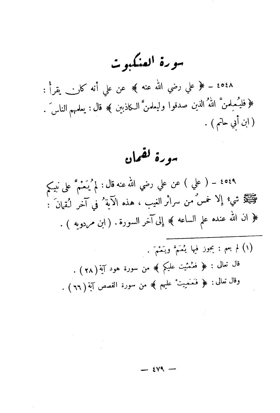 4549- "علي" عن علي رضي الله عنه قال: "لم يعم1 على نبيكم صلى الله عليه وسلم شيء إلا خمس من سرائر الغيب، هذه الآية في آخر لقمان: {إِنَّ اللَّهَ عِنْدَهُ عِلْمُ السَّاعَةِ} إلى آخر السورة". "ابن مردويه".