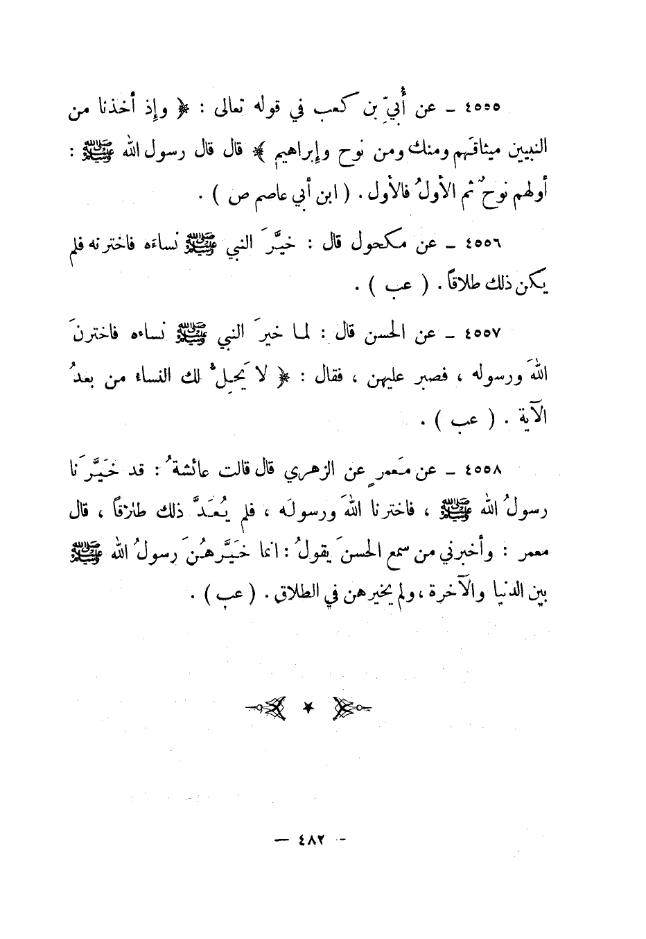 4557- عن الحسن قال: "لما خير النبي صلى الله عليه وسلم نساءه فاخترن الله ورسوله، فصبر عليهن، فقال: {لا يَحِلُّ لَكَ النِّسَاءُ مِنْ بَعْدُ} الآية. "عب".